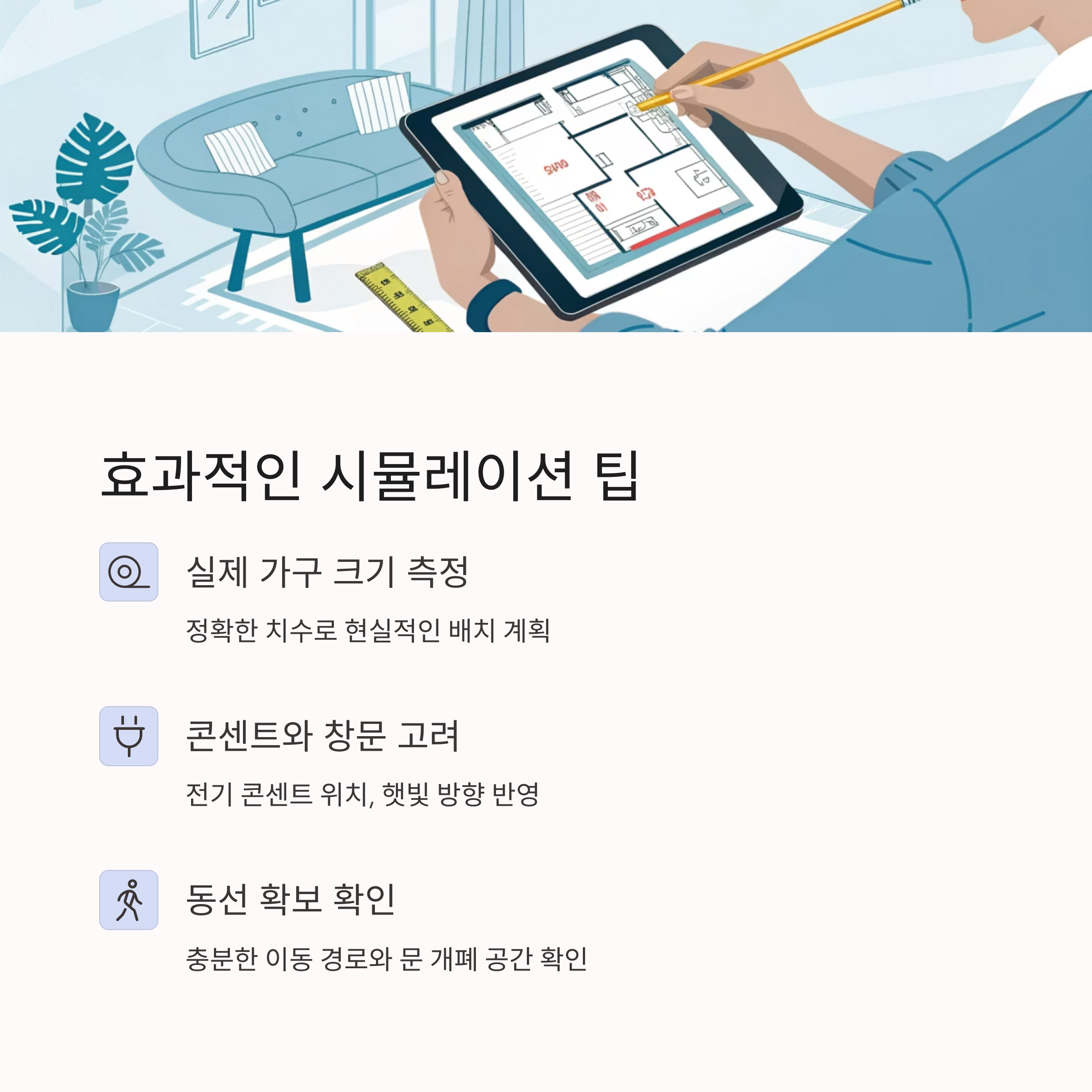 - 콘센트 위치, 창문 방향 고려: 가구 배치 시 전기 콘센트 위치, 창문 방향, 햇빛 드는 정도 등을 고려하면 더욱 현실적인 계획을 세울 수 있습니다.