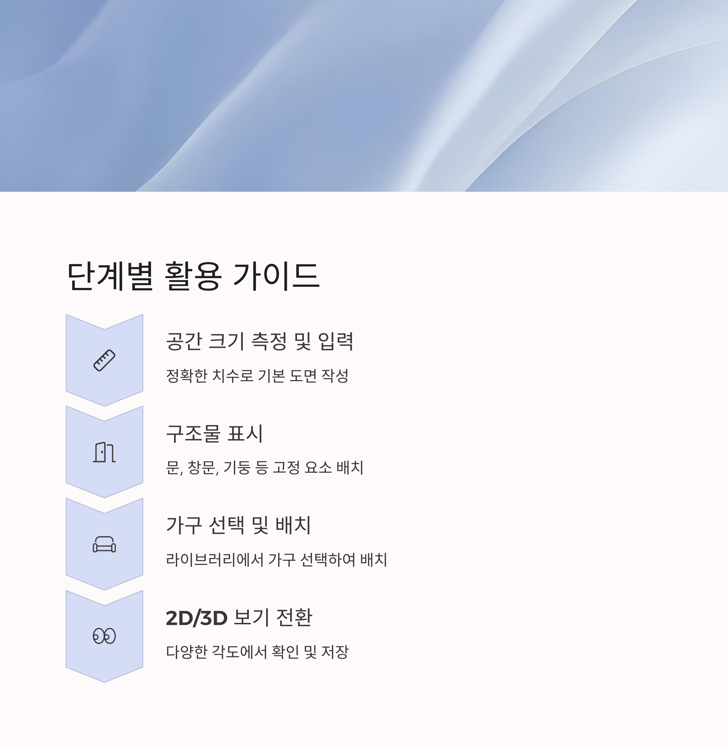 - 시각적 구상: 2D 평면도나 3D 입체 화면을 통해 실제 모습을 생생하게 미리 볼 수 있습니다.