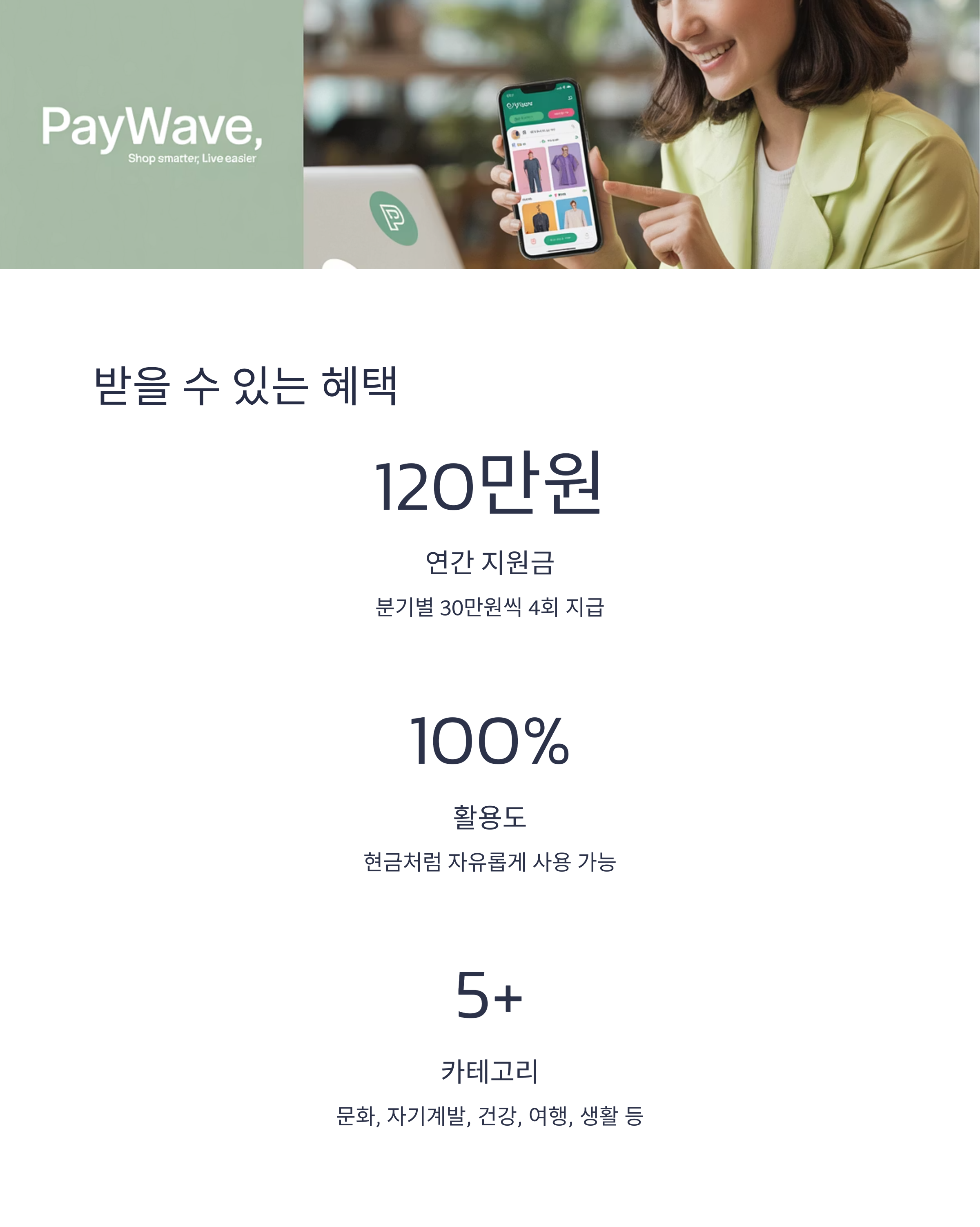 - 연 최대 120만 원(분기별 30만 원씩 4회 분할) 복지포인트 지급