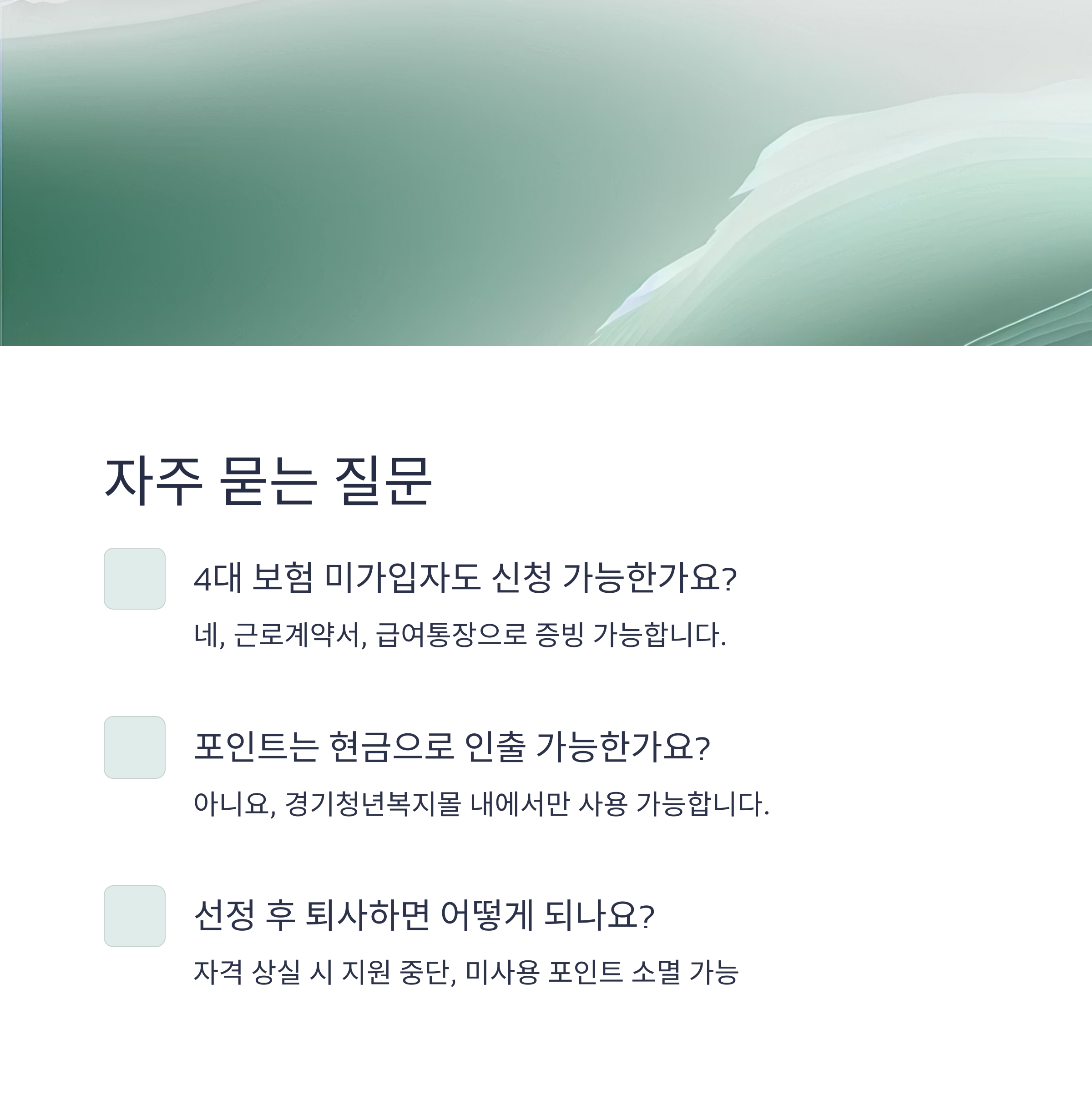 A. 아니요, 경기청년복지몰 내에서만 사용 가능합니다. - Q. 선정 후 퇴사하면 어떻게 되나요?
