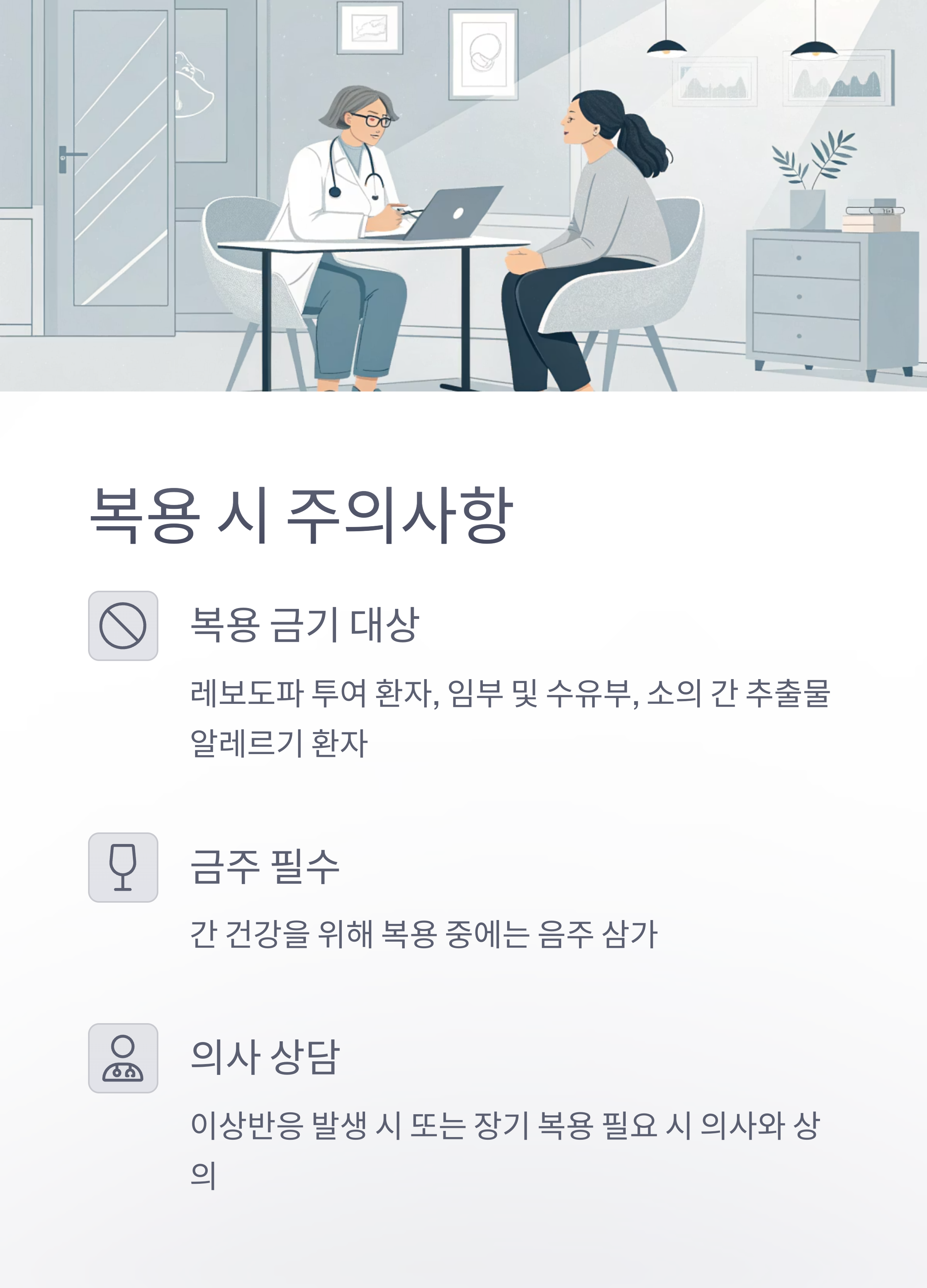 - 복용 중 이상반응이 있거나, 장기 복용이 필요할 때는 반드시 의사와 상의하세요.