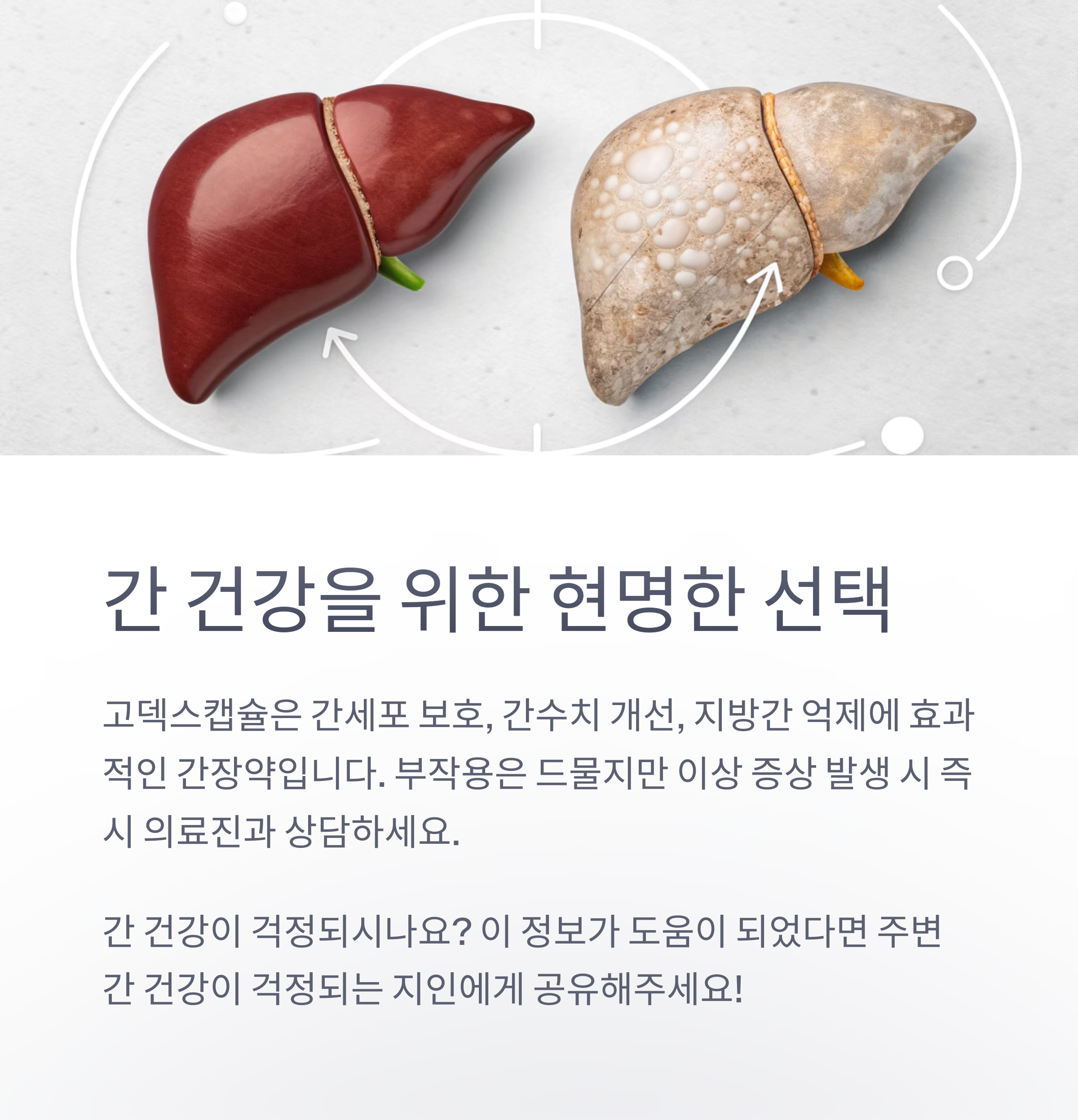 고덱스캡슐은 간세포 보호, 간수치 개선, 지방간 억제 등 다양한 효능을 가진 간장약으로, 처방에 따라 안전하게 복용하면 좋은 효과를 기대할 수 있습니다. 부작용은 드물지만, 복용 중 이상 증상이 나타나면 즉시 의료진과 상담해야 하며, 임신부·수유부·특정 알레르기 환자·레보도파 복용 환자는 복용을 피해야 합니다. 간 건강을 위해서는 반드시 전문의의 처방과 지시에 따라 복용하세요.