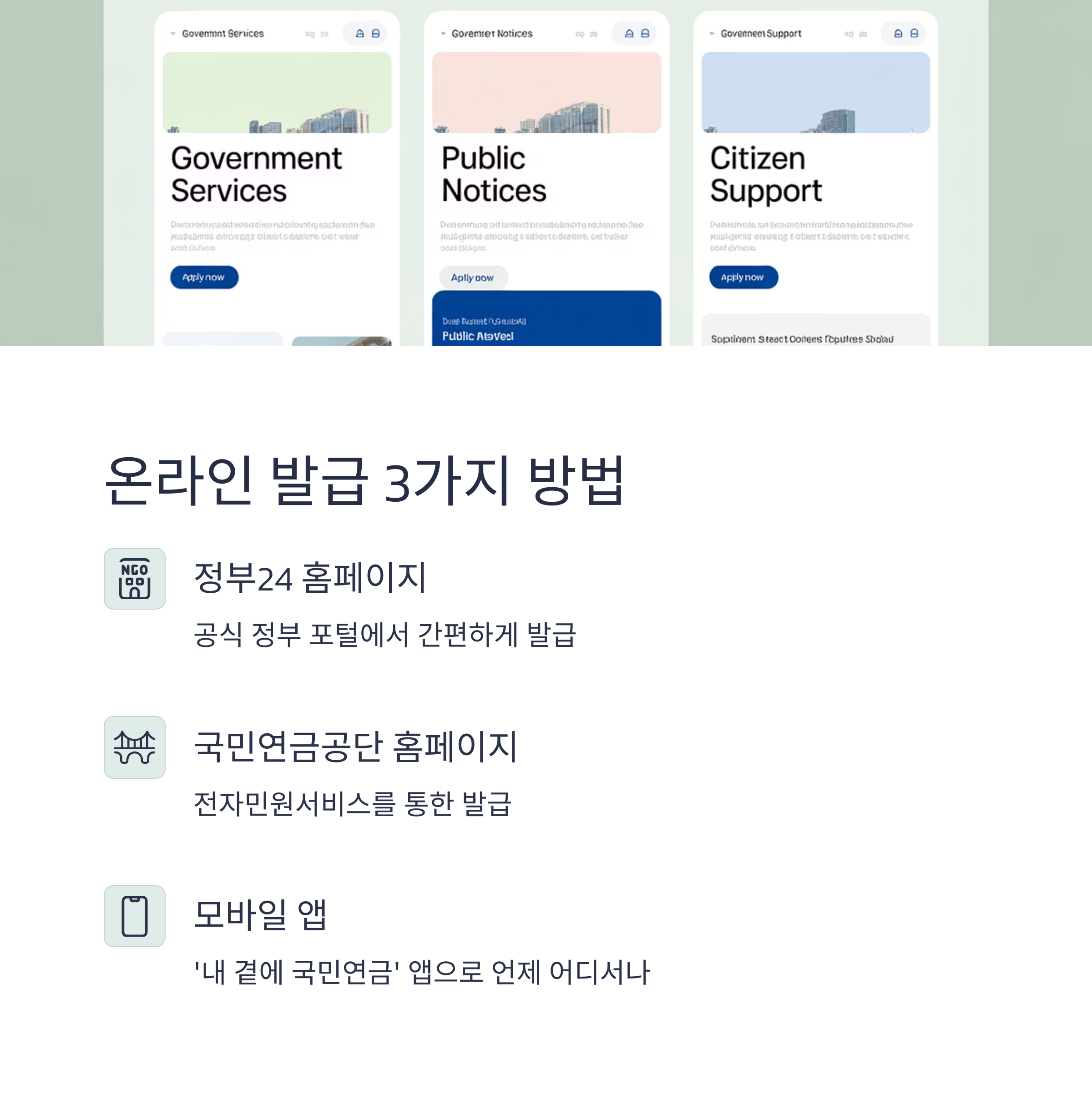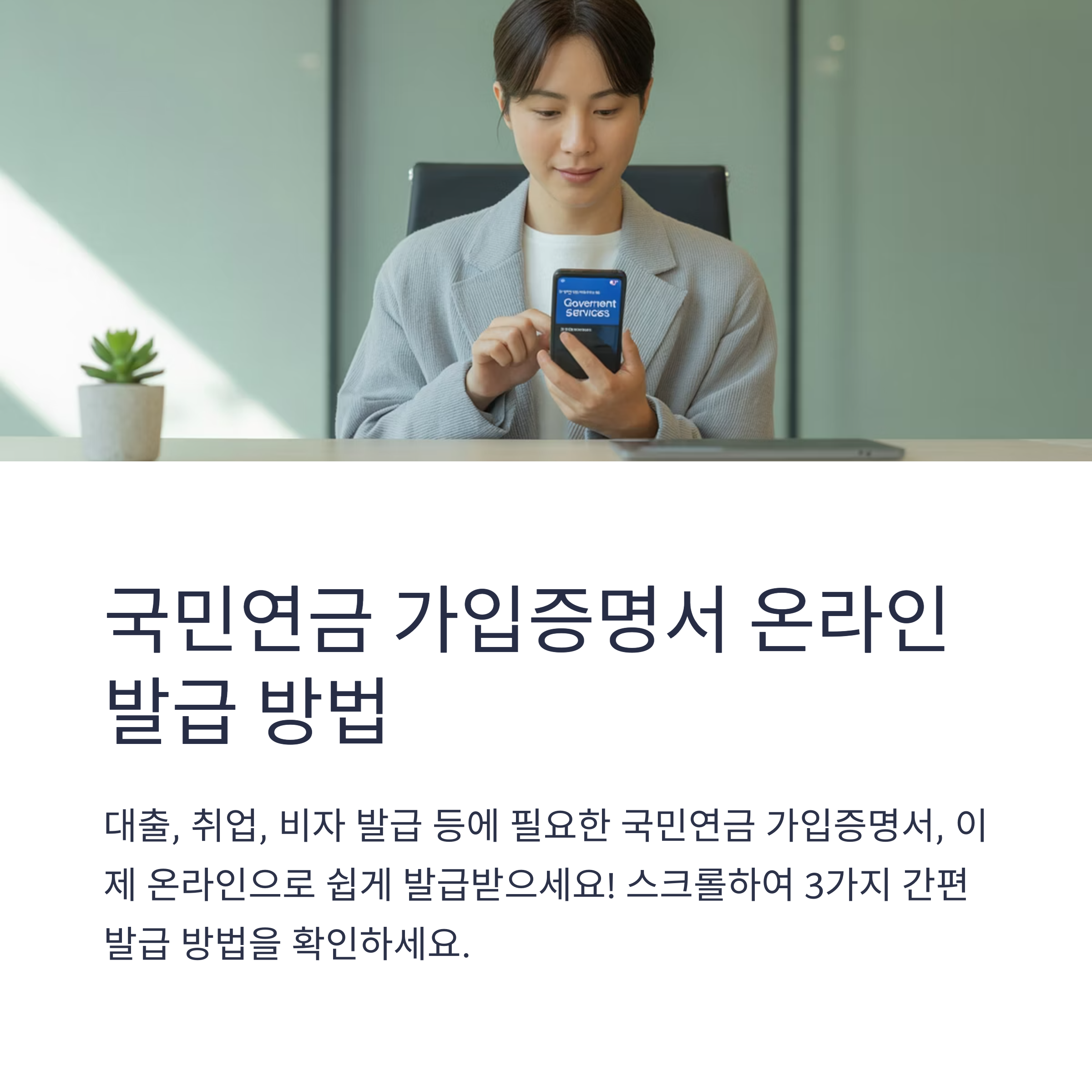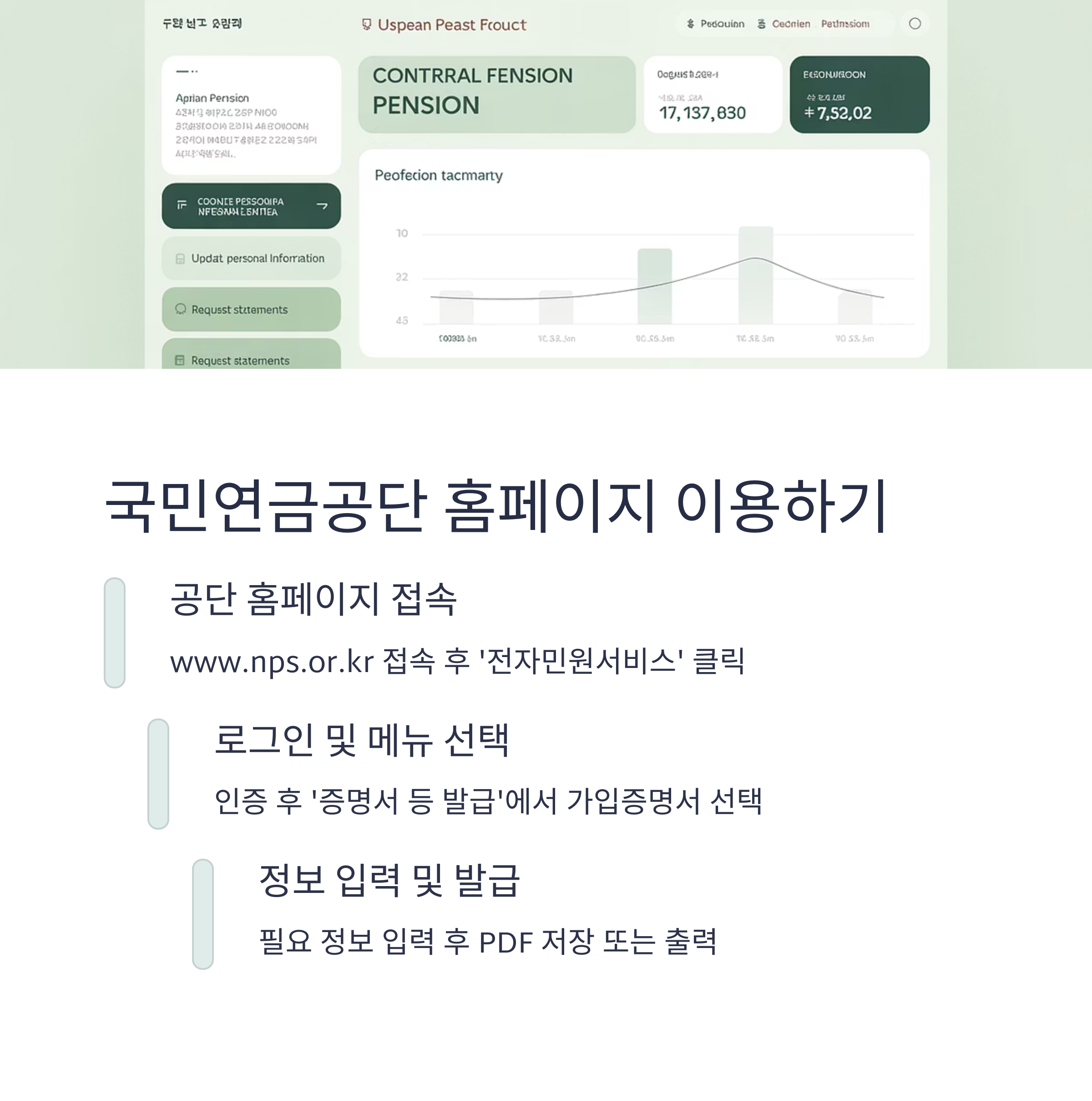 국민연금 가입증명서는 정부24, 국민연금공단 홈페이지, 모바일 앱 등에서 쉽고 빠르게 온라인 발급이 가능합니다. 필요할 때마다 간편하게 PDF 저장 또는 출력해 다양한 용도로 활용하세요.
