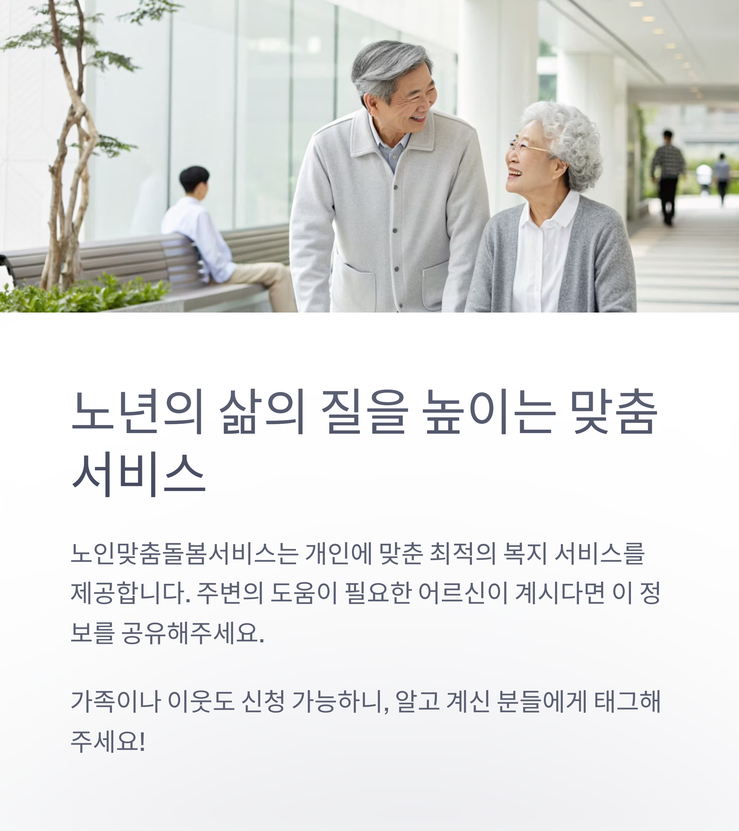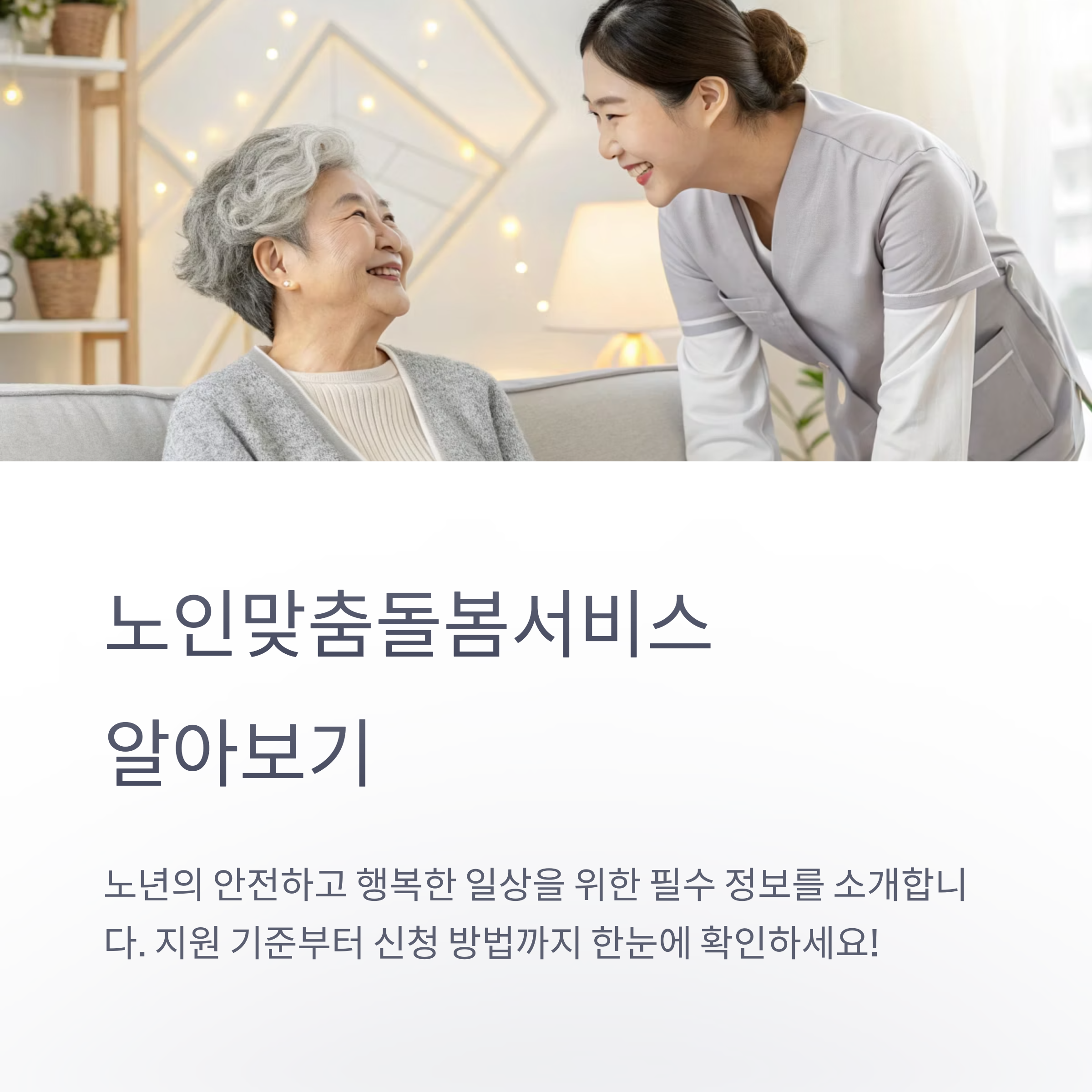 노인맞춤돌봄서비스는 노인의 일상과 안전을 지원하며, 개인에 맞춘 최적의 복지 서비스를 제공합니다.