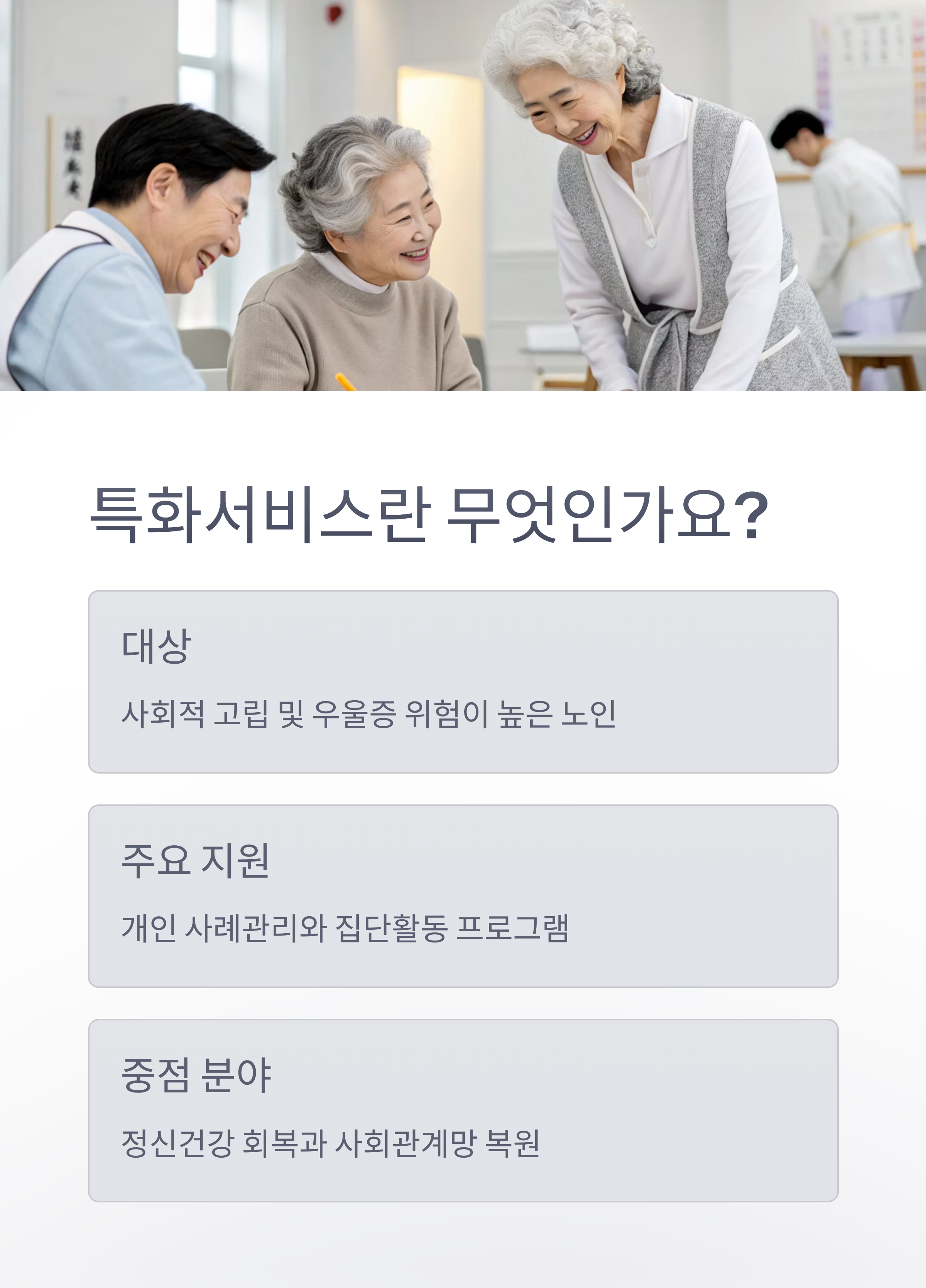 | 특화서비스는 사회적 고립 및 우울증 위험이 높은 노인을 대상으로 제공합니다. 주요 지원으로는 개인 사례관리와 집단활동 프로그램이 포함됩니다. 특화서비스는 정신건강 회복과 사회관계망 복원에 중점을 둡니다. 일반 돌봄서비스와 병행 가능하며, 수혜자가 기관 직접 추천을 받을 수도 있습니다. 신청 절차는 수행기관 방문 또는 읍·면·동 공무원을 통해 접수합니다. |