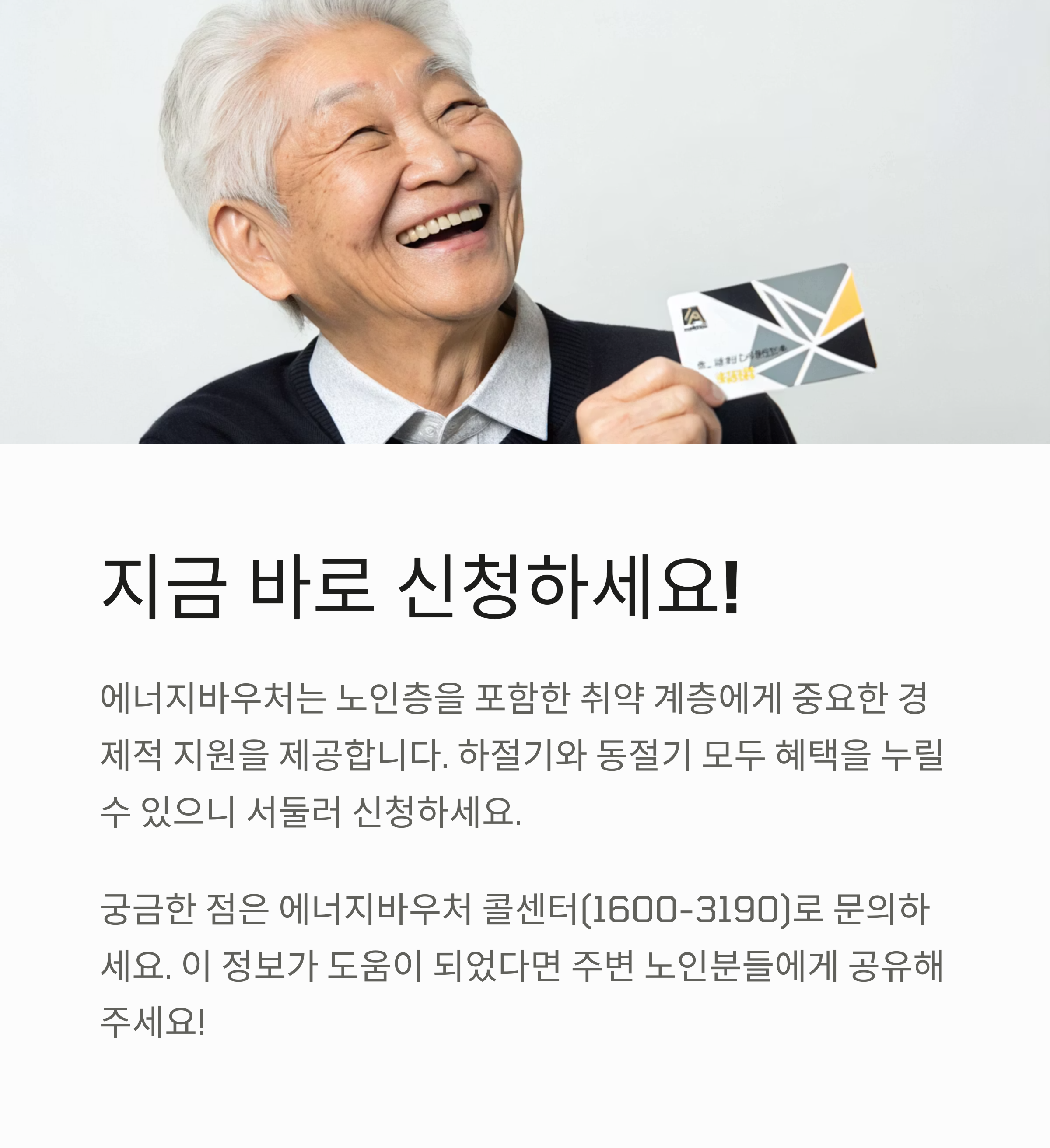 안녕하세요, 오늘은 노인 대상 에너지바우처 신청 방법에 대해 정리한 정보를 공유해 드립니다.