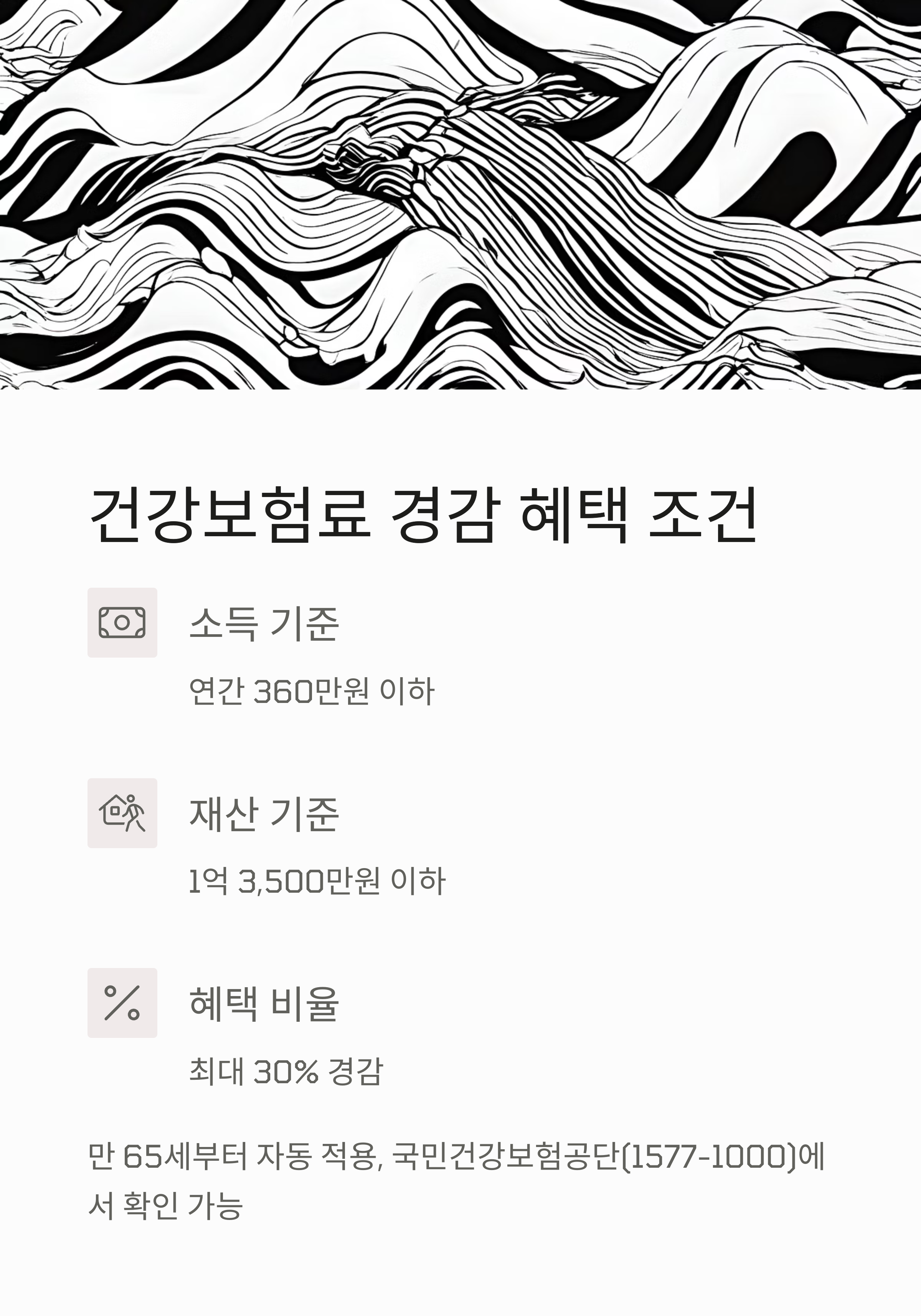 | 건강보험료 경감 혜택을 받으려면 소득과 자산 기준을 충족해야 합니다. 소득은 연간 360만 원 이하이어야 하며, 재산은 1억 3,500만 원 이하여야 합니다. 조건을 충족하면 건강보험료가 최대 30%까지 경감됩니다. 만 65세부터 혜택이 자동 적용되며, 확인을 위해 국민건강보험공단에 문의하세요. 고객센터(1577-1000)에서 본인의 적용 상황을 확인할 수 있습니다. |