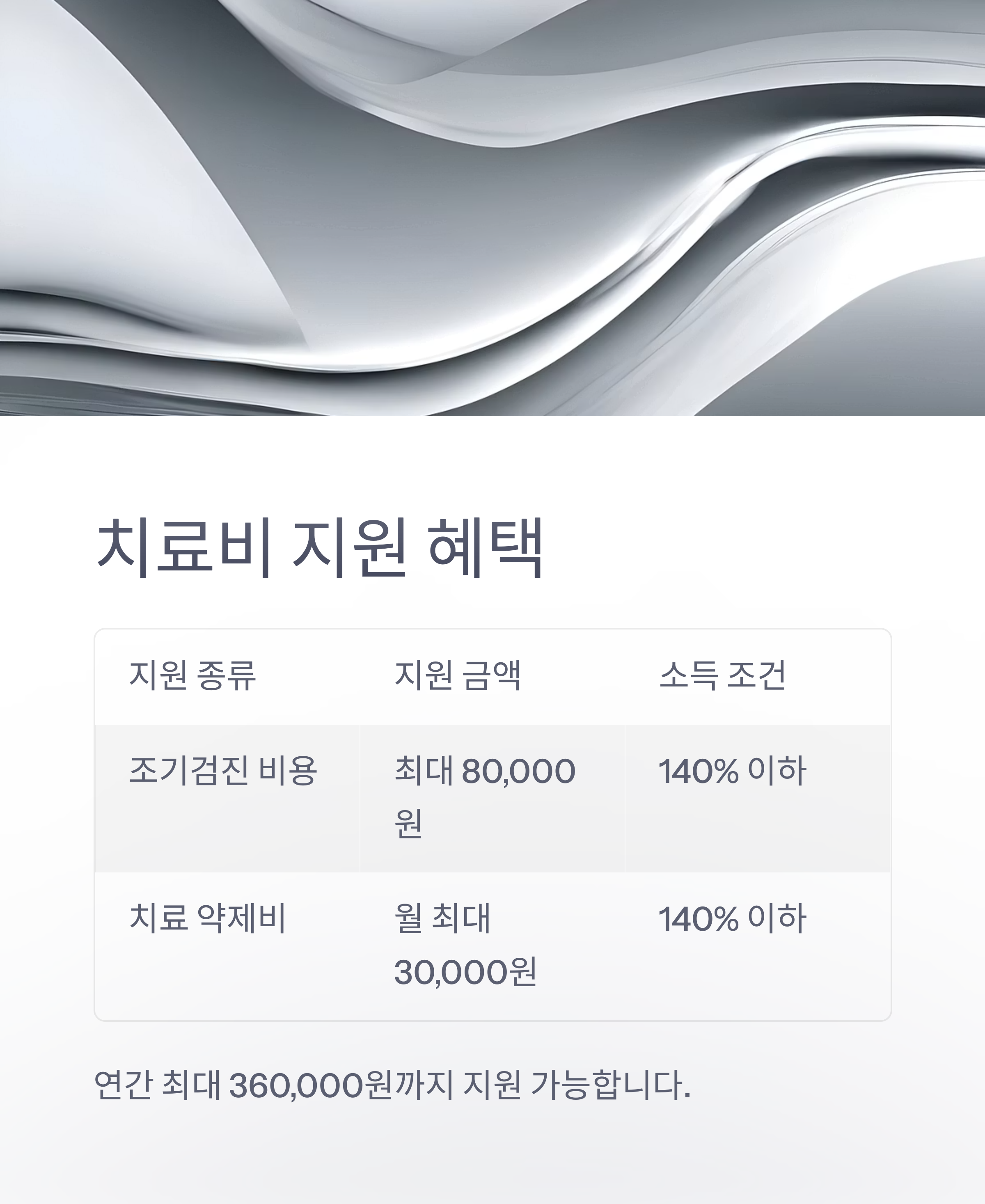 | 치료 약제비 | 월 최대 30,000원 | 140% 이하 | 연간 360,000원 |