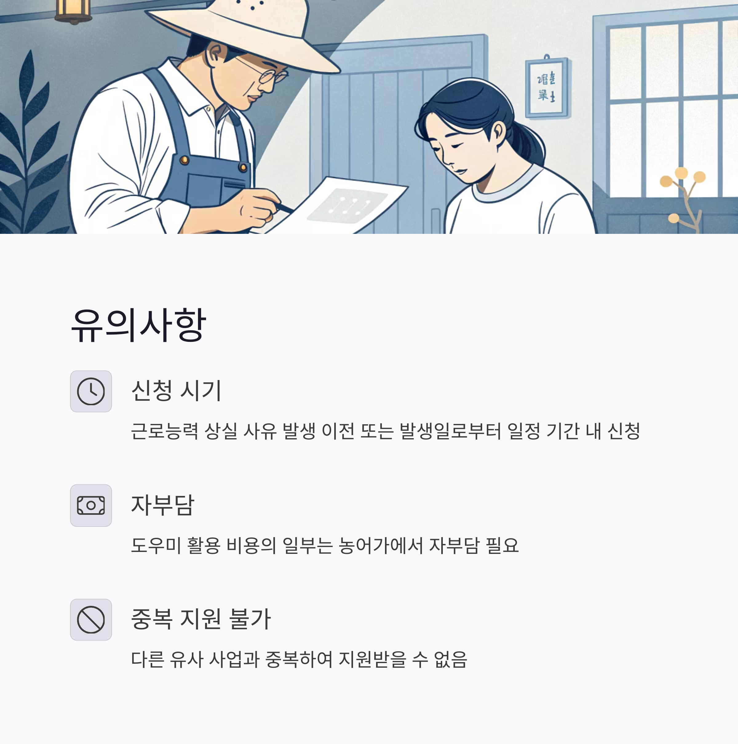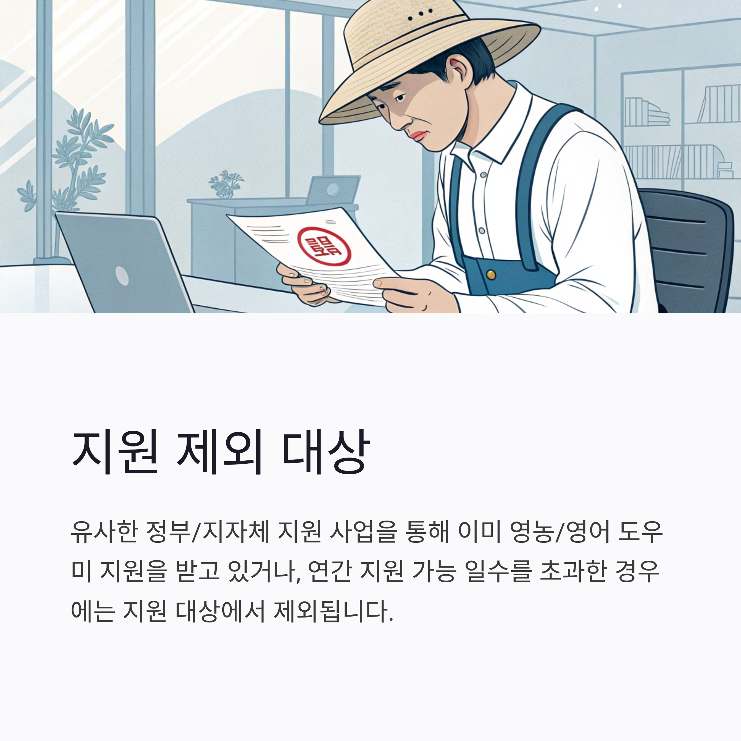 위 조건을 충족하더라도, 유사한 정부 또는 지자체 지원 사업을 통해 이미 영농/영어 도우미 지원을 받고 있거나, 해당 사업에서 정한 연간 지원 가능 일수를 초과한 경우에는 지원 대상에서 제외될 수 있습니다.