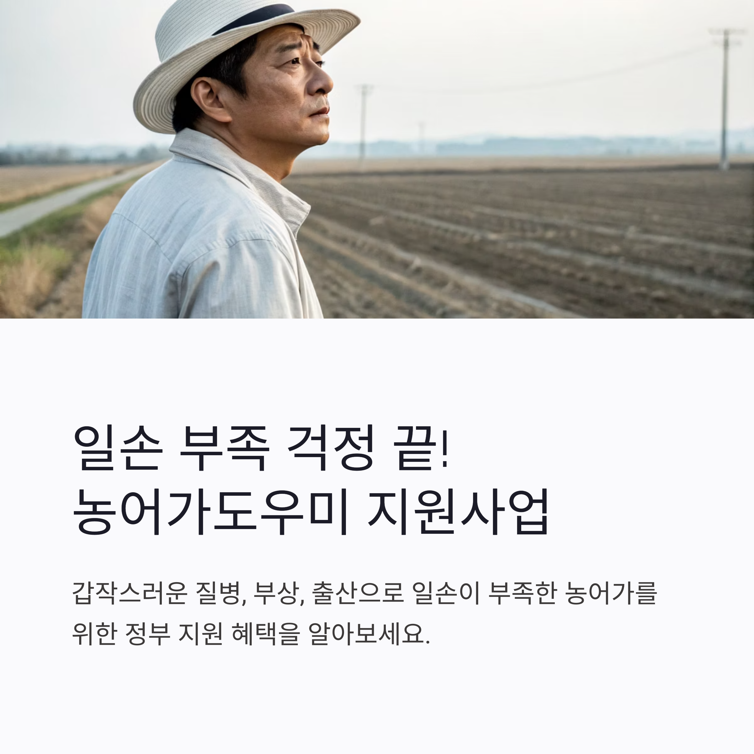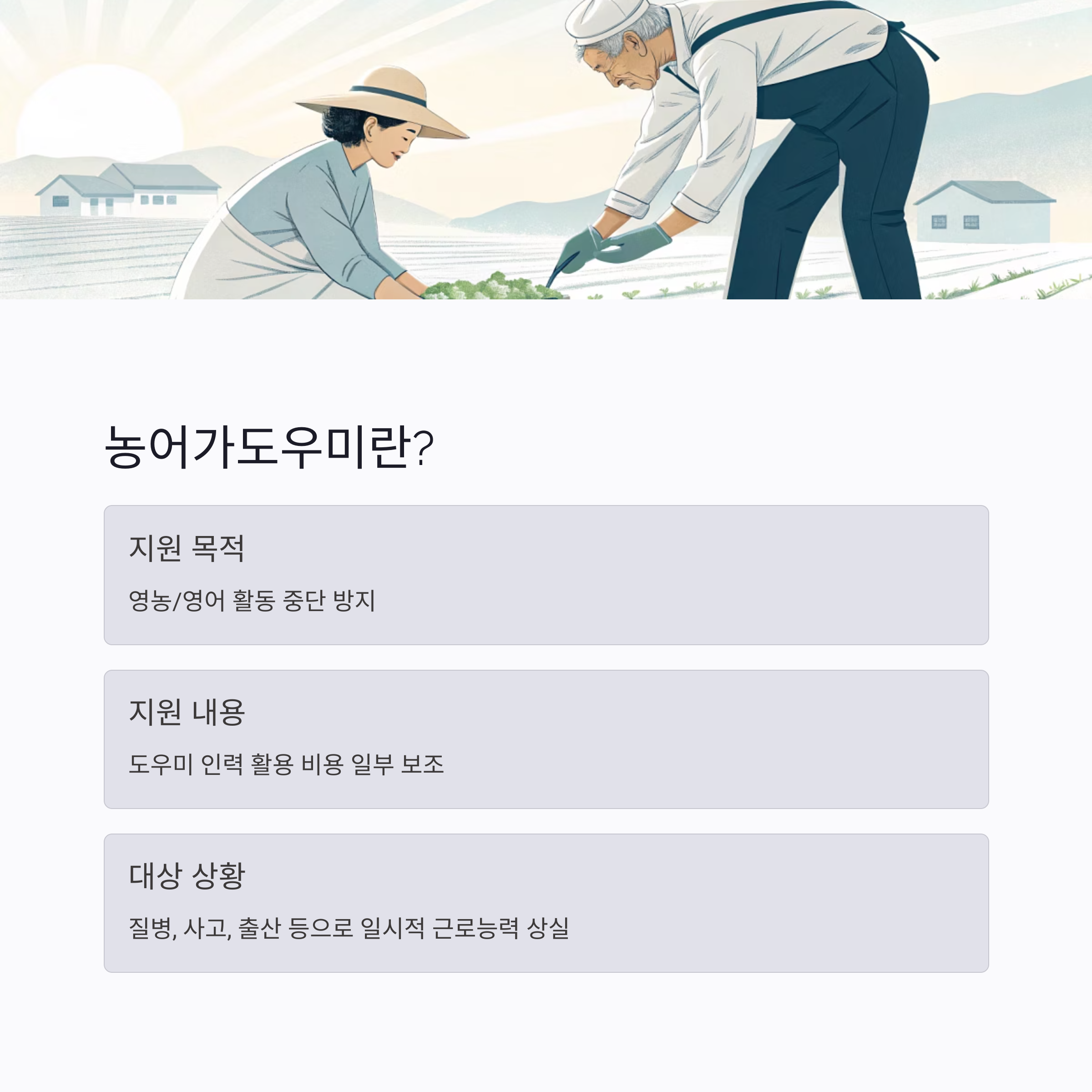 농어촌에서는 갑작스러운 질병, 부상, 사고, 출산 등으로 인해 주된 일손이 자리를 비우게 되면 영농 또는 영어 활동에 큰 차질이 발생할 수 있습니다. 특히 고령화 등으로 인해 대체 인력을 찾기 어려운 농어가에서는 이러한 상황이 곧바로 소득 감소 및 경영 불안정으로 이어지곤 합니다.