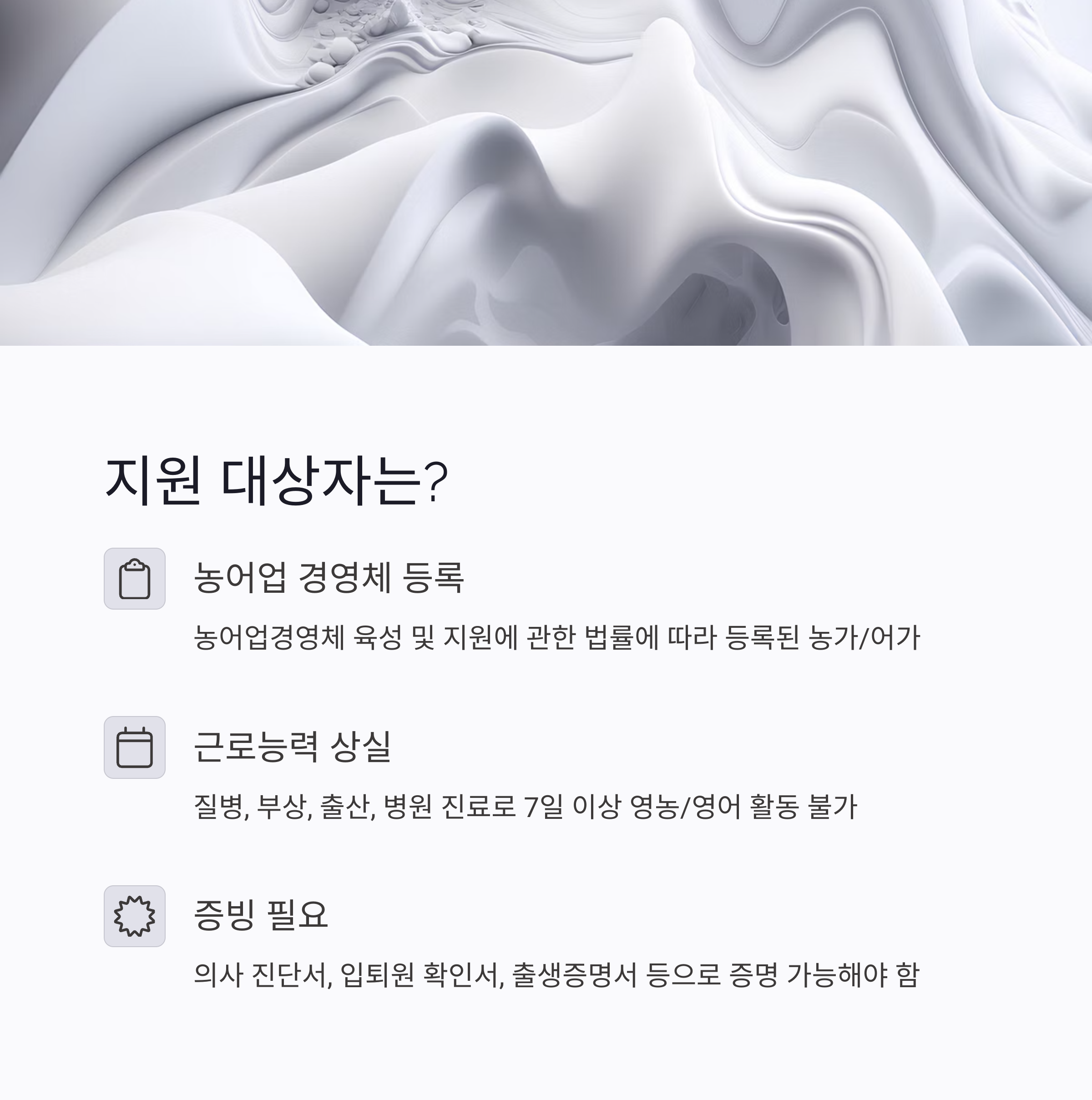 해당 농가 또는 어가의 주된 영농/영어 종사자가 다음 사유로 인해 영농/영어 활동에 1주일(7일) 이상 종사할 수 없는 경우에 지원 대상이 됩니다.