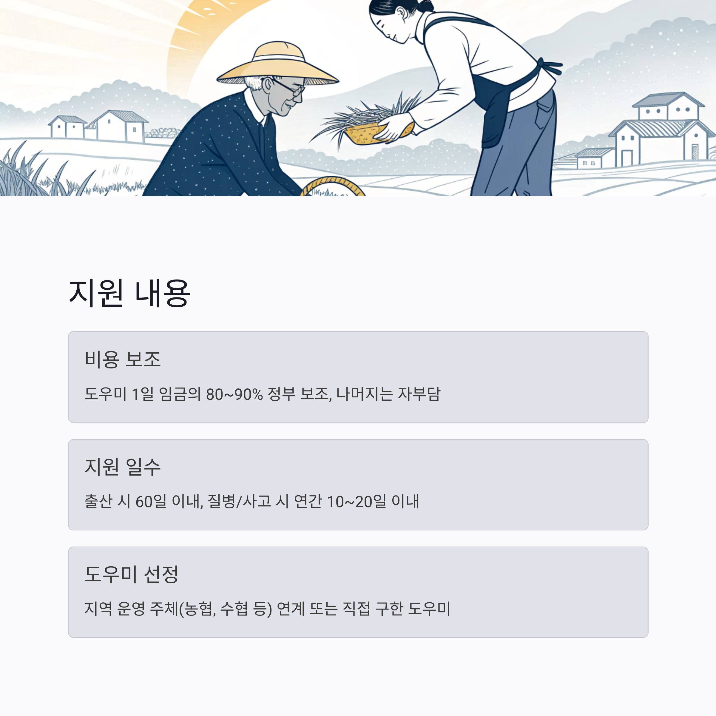 - 도우미 활용 비용의 일부는 농어가에서 자부담해야 합니다.