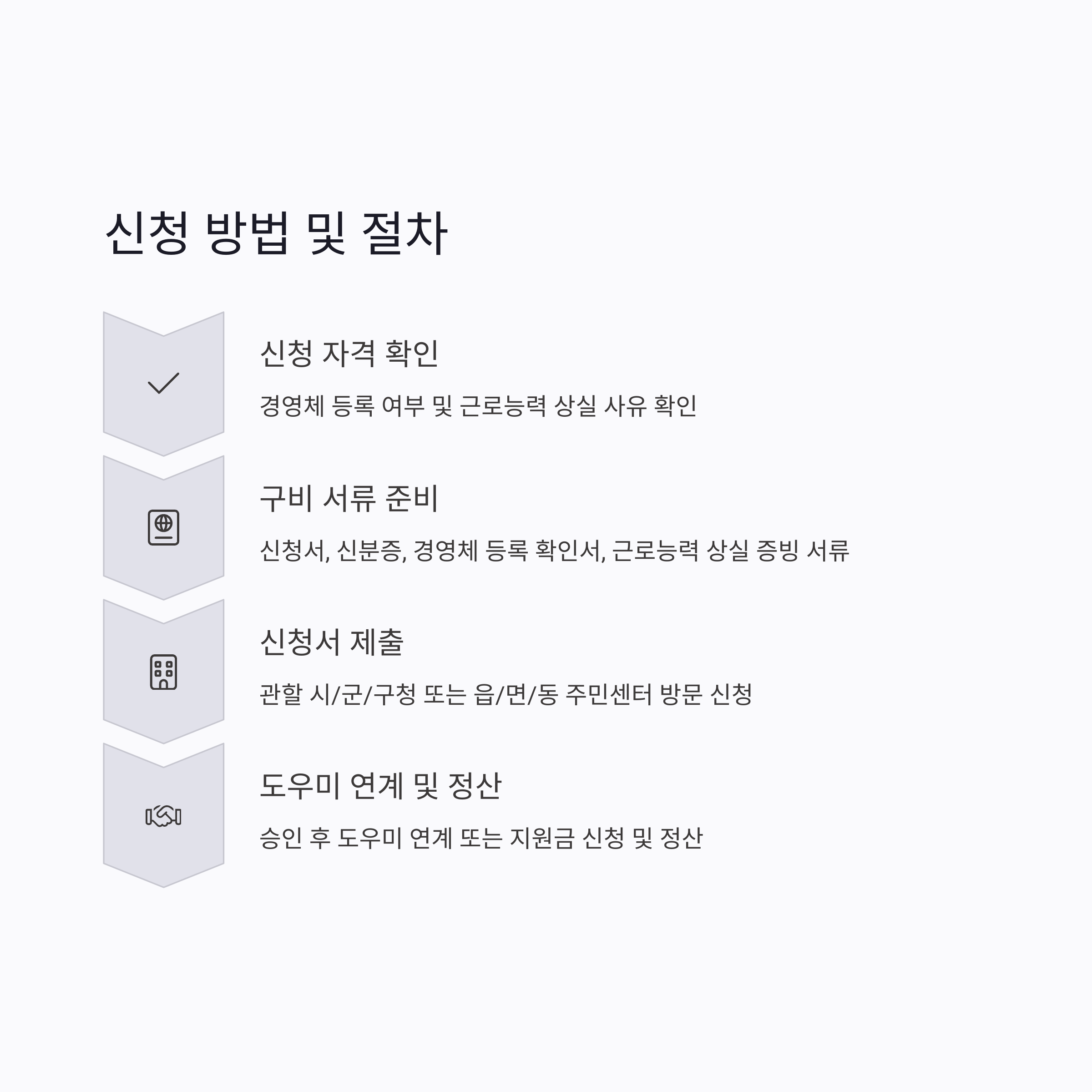 - 검토 및 승인: 제출된 서류와 현황 조사를 통해 지원 대상 적격 여부 및 지원 기간 등을 검토하여 승인합니다.