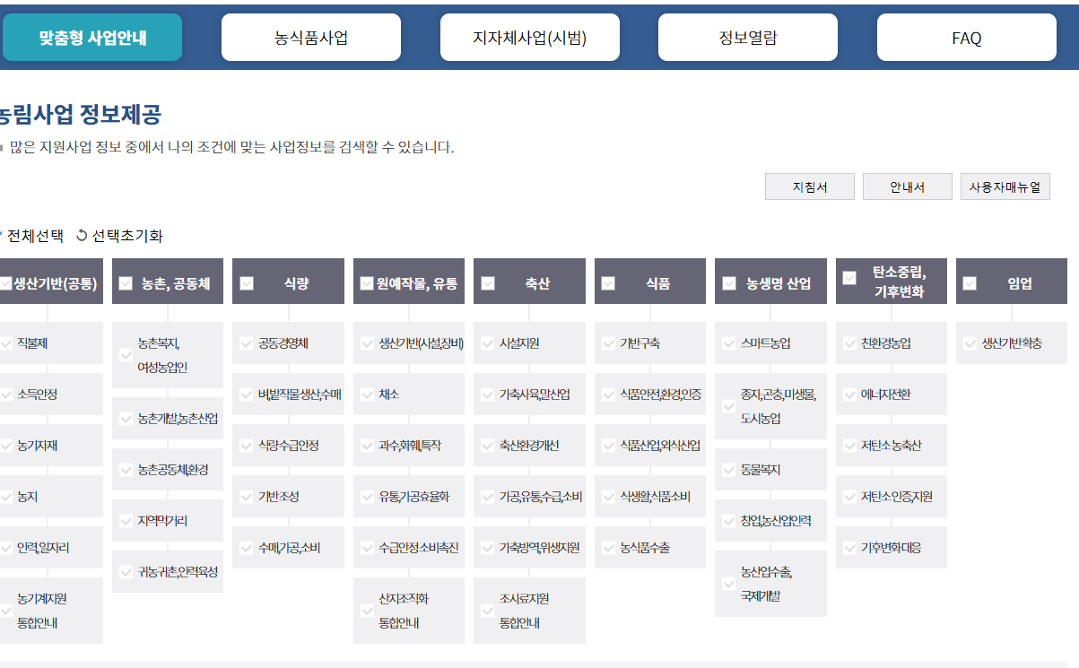 | 스마트팜 농업인 | 스마트팜 기술 적용 농업인 | 시설 자금 지원, 기술 컨설팅 제공 |