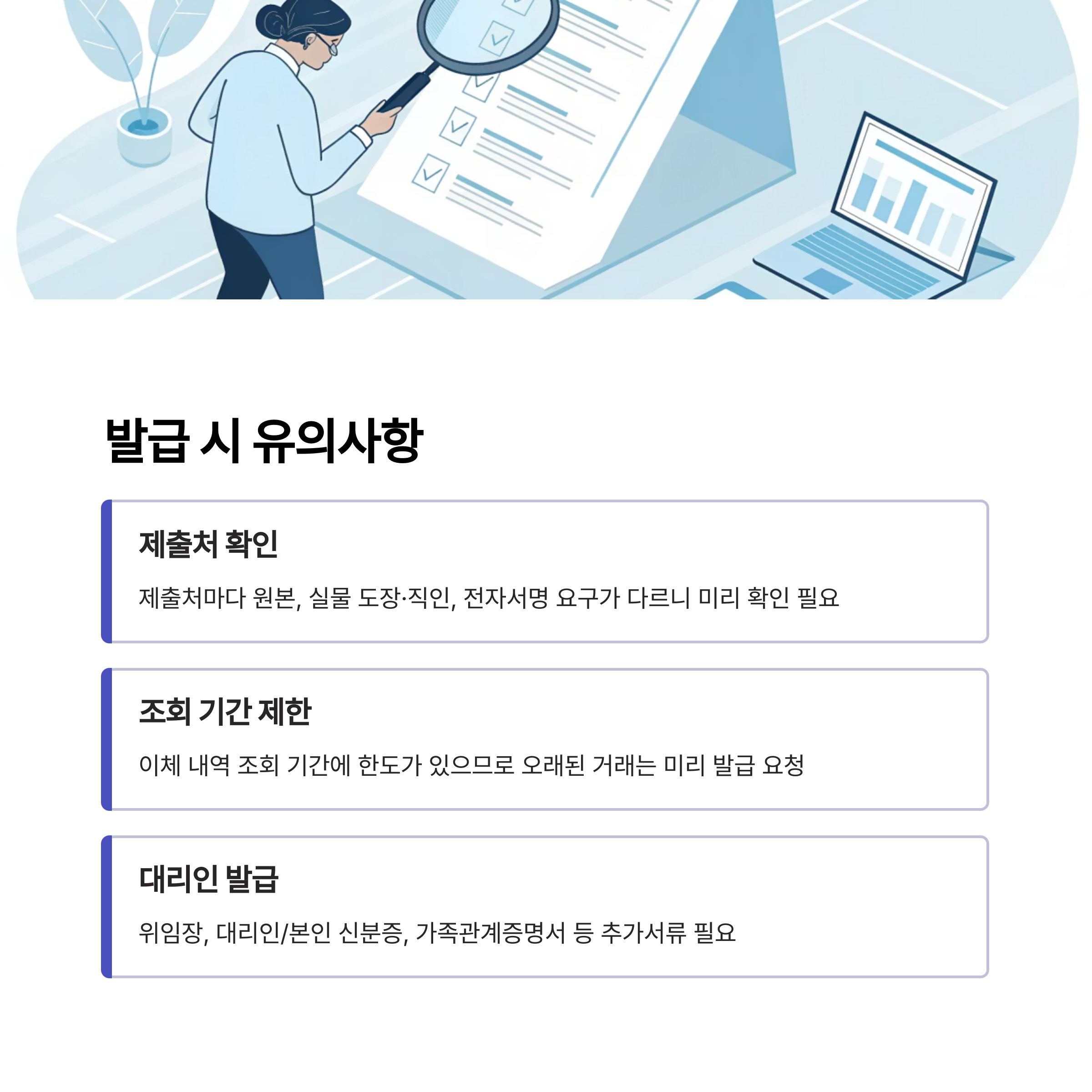 - 대리인 발급은 위임장, 신분증 추가 필요