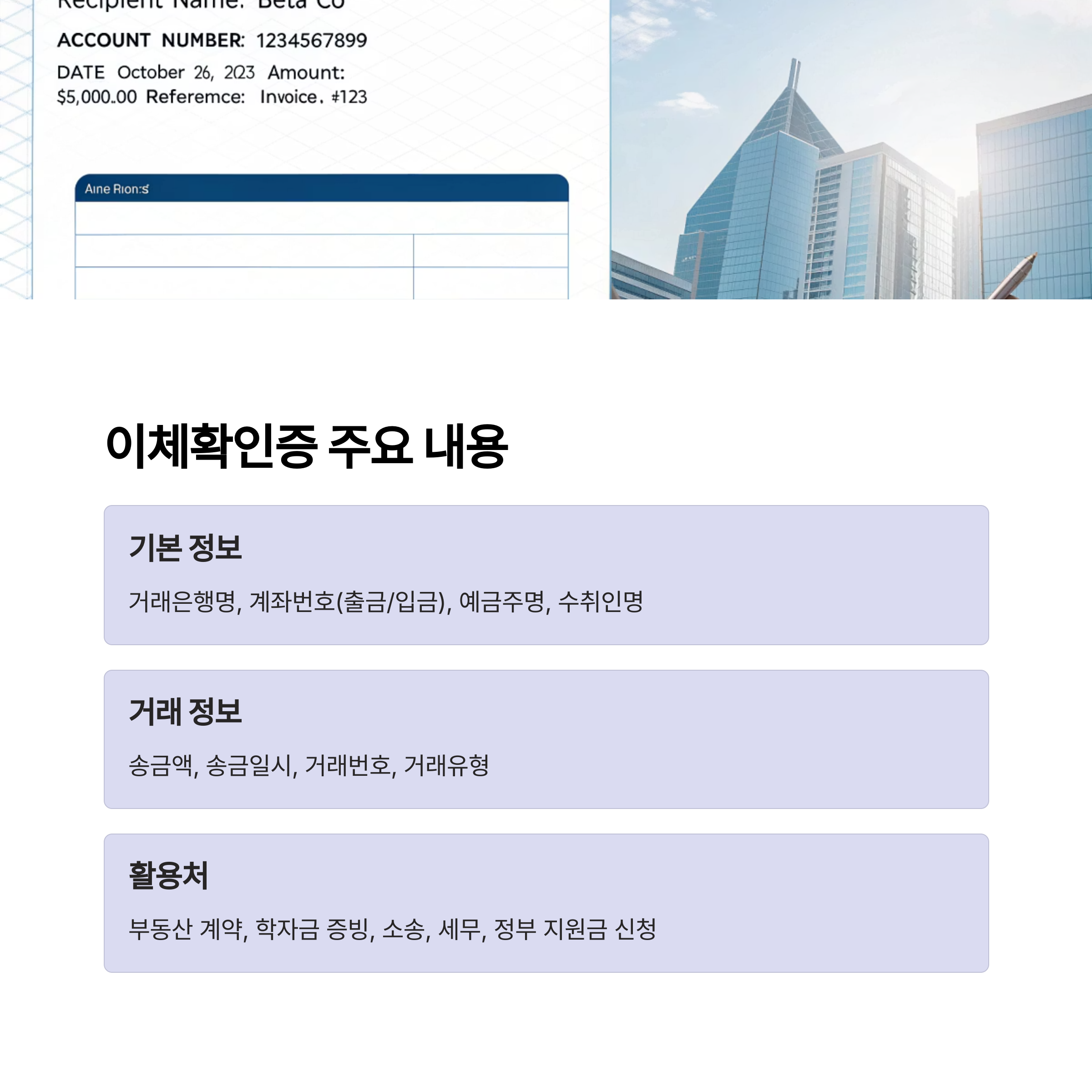- 부동산 계약(계약금·잔금 송부 증빙), 전월세 신고, 학자금 증빙, 각종 소송, 세무, 정부 지원금 신청, 유학/비자 서류 등 각종 법률·행정 용도로 활용