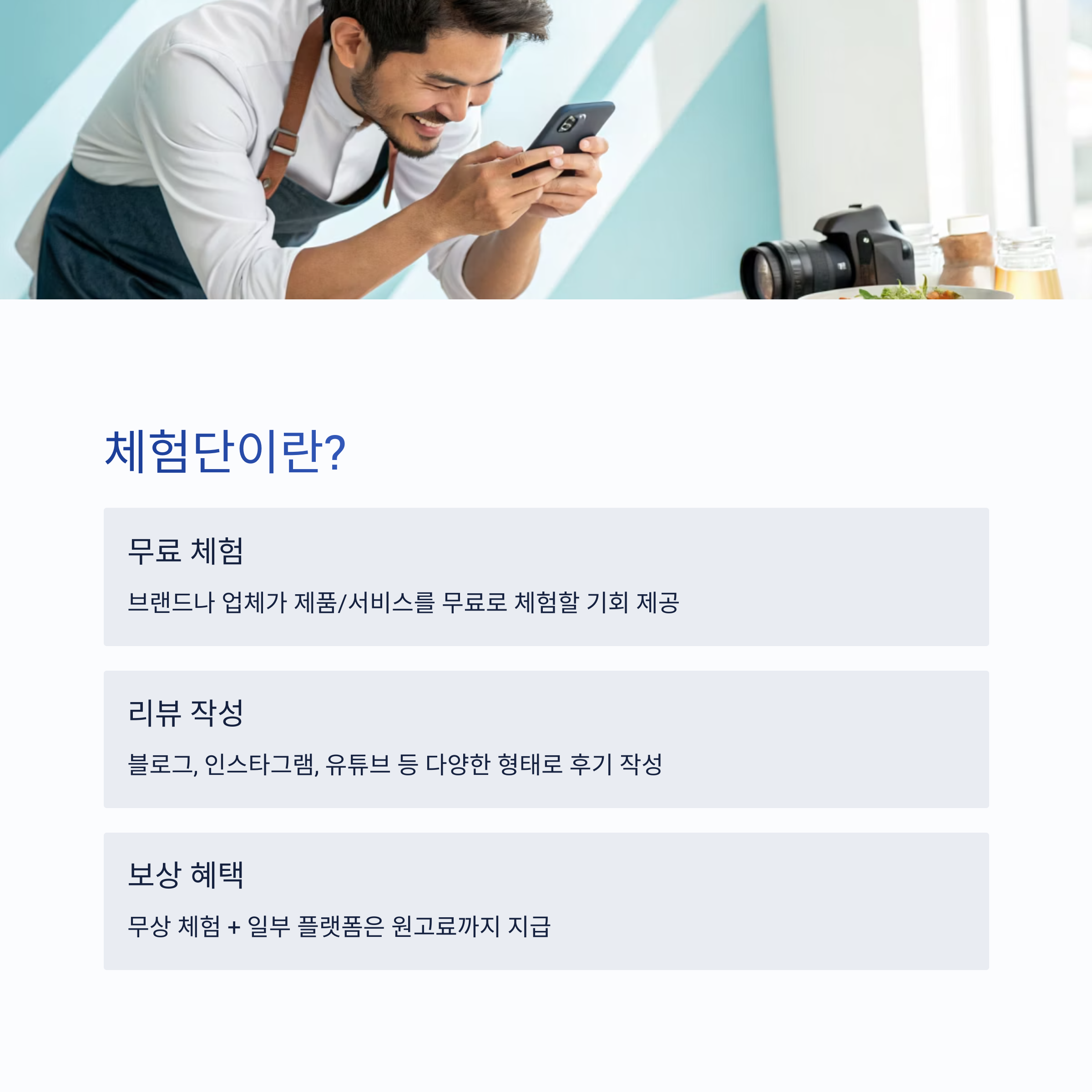 체험단이란 브랜드 또는 업체가 자사 제품이나 서비스를 무료로 체험할 기회를 제공하고, 리뷰 콘텐츠를 작성하도록 하는 마케팅 방식입니다.