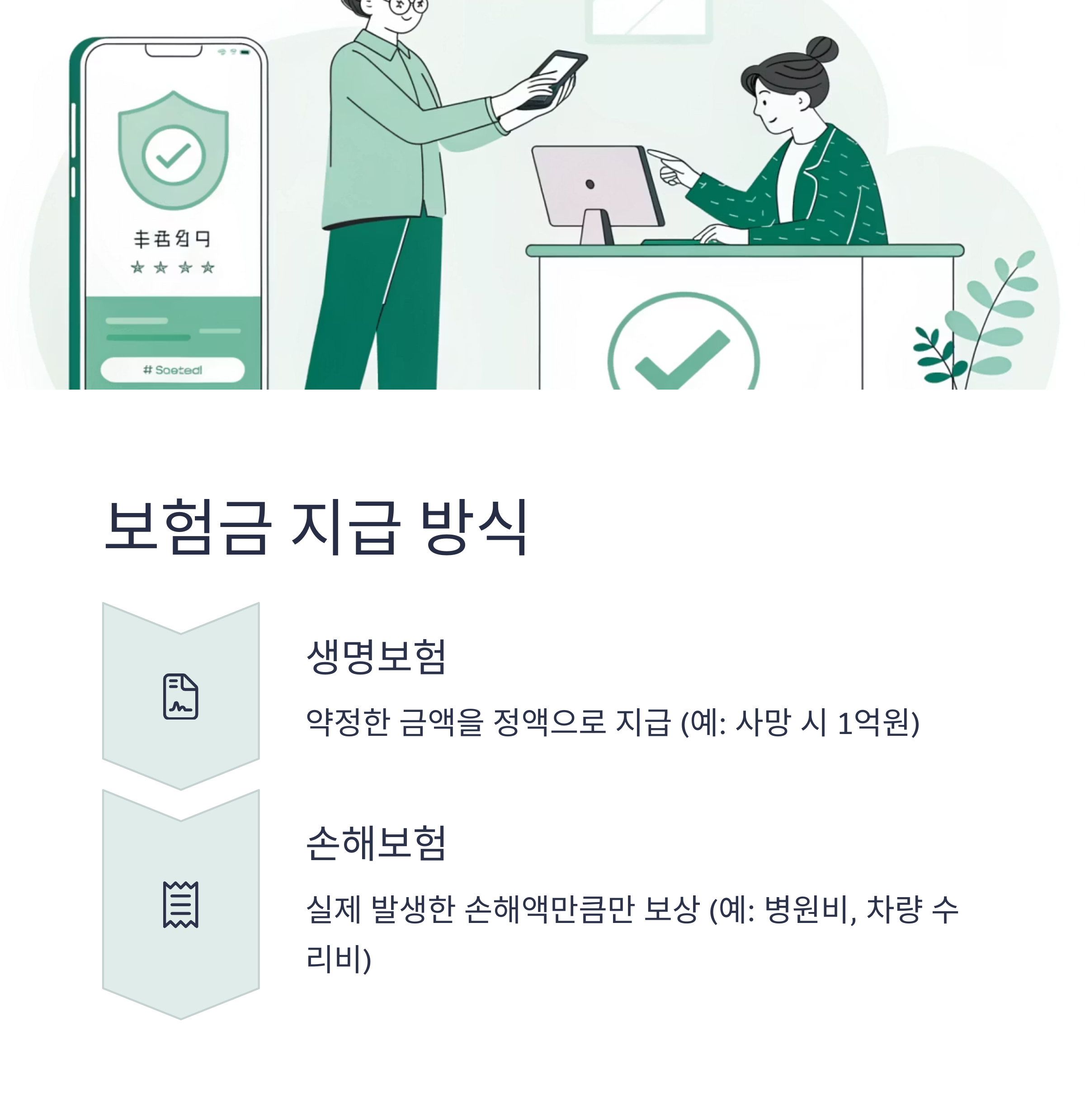생명보험은 사람의 생명, 사망, 생존, 노후 등 인적 위험을 보장합니다. 반면 손해보험은 자동차, 건물, 화재, 도난, 배상책임 등 재산상의 우연한 사고와 손해를 보장합니다. 단, 손해보험도 실손의료, 상해, 배상책임 등 사람 관련 보장을 포함할 수 있습니다. - 2. 보험금 지급 방식
