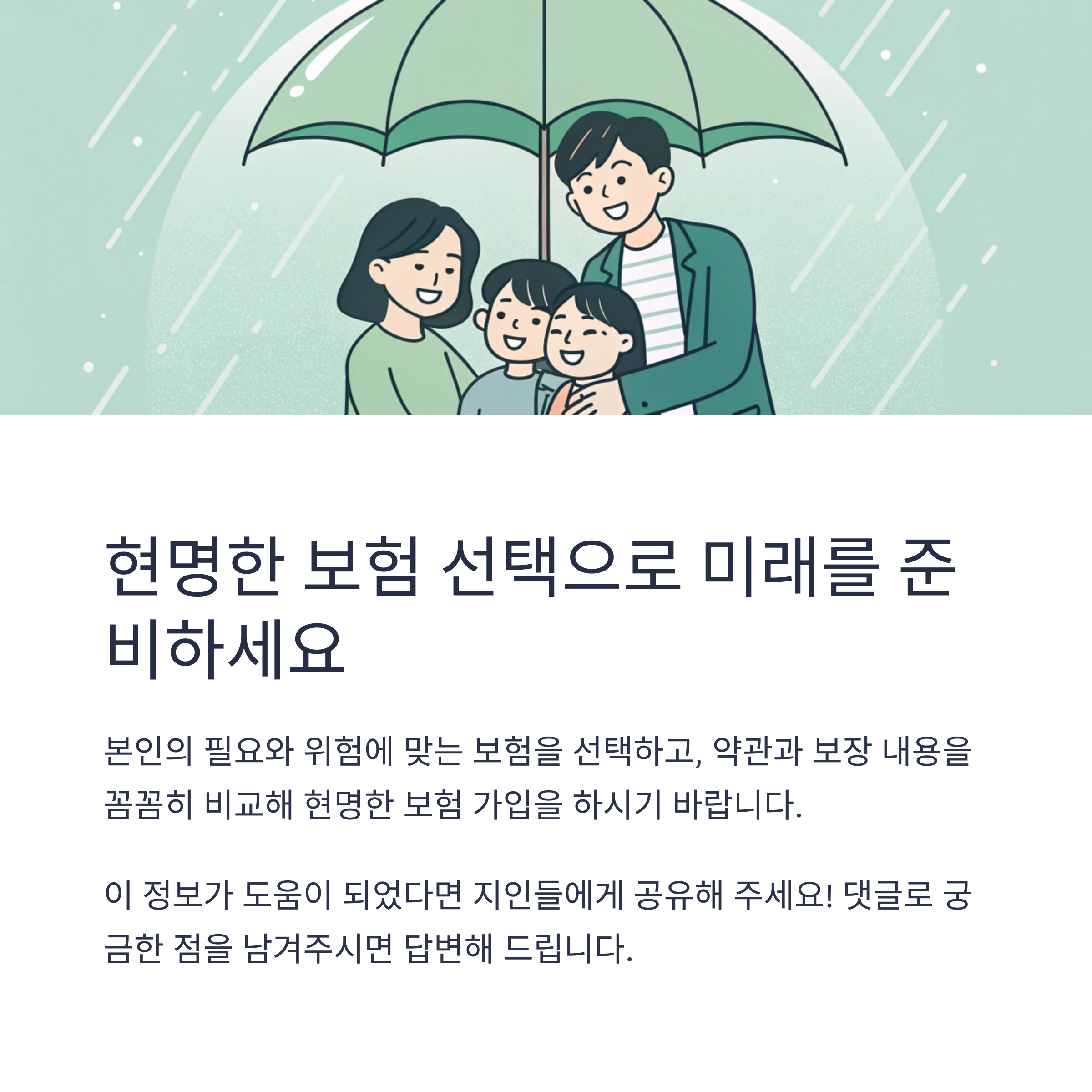 - 보장 방식(정액/실손), 담보 구성 등에서 회사별 차이가 있으므로, 가입 전 조건을 꼼꼼히 비교해야 합니다.