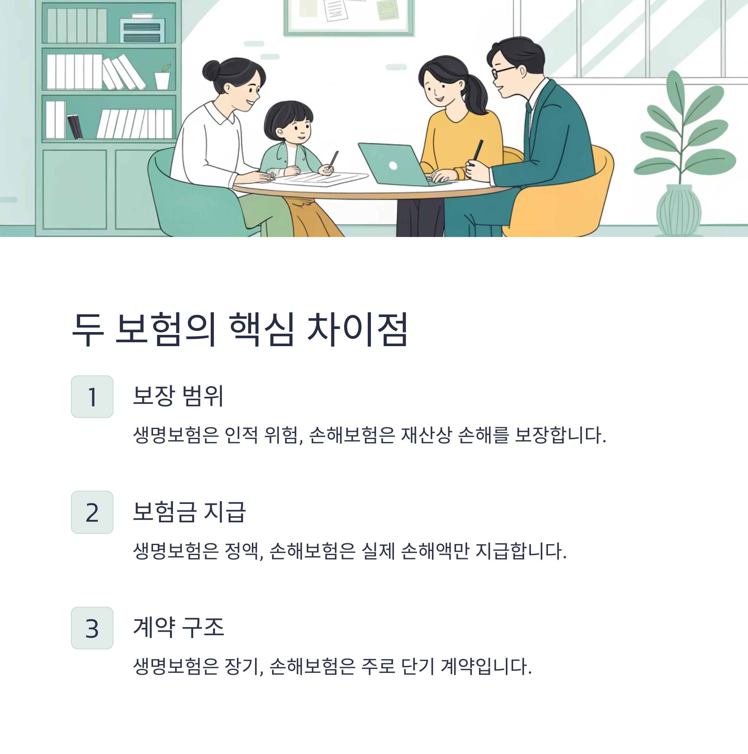 생명보험과 손해보험은 보장 대상, 보험금 지급 방식, 계약 구조 등에서 본질적으로 다릅니다. 본인의 필요와 위험에 맞는 보험을 선택하고, 상품별 약관과 보장 내용을 꼼꼼히 비교해 현명한 보험 가입을 하시기 바랍니다.