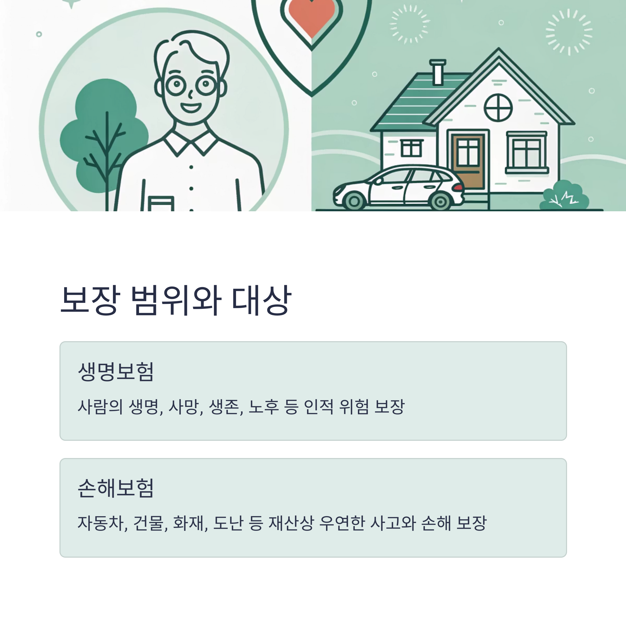 | 보장 대상 | 사람의 생명, 사망, 생존, 노후 등 인적 위험 | 재산상의 손해(자동차, 화재, 도난 등) 및 우연한 사고 |