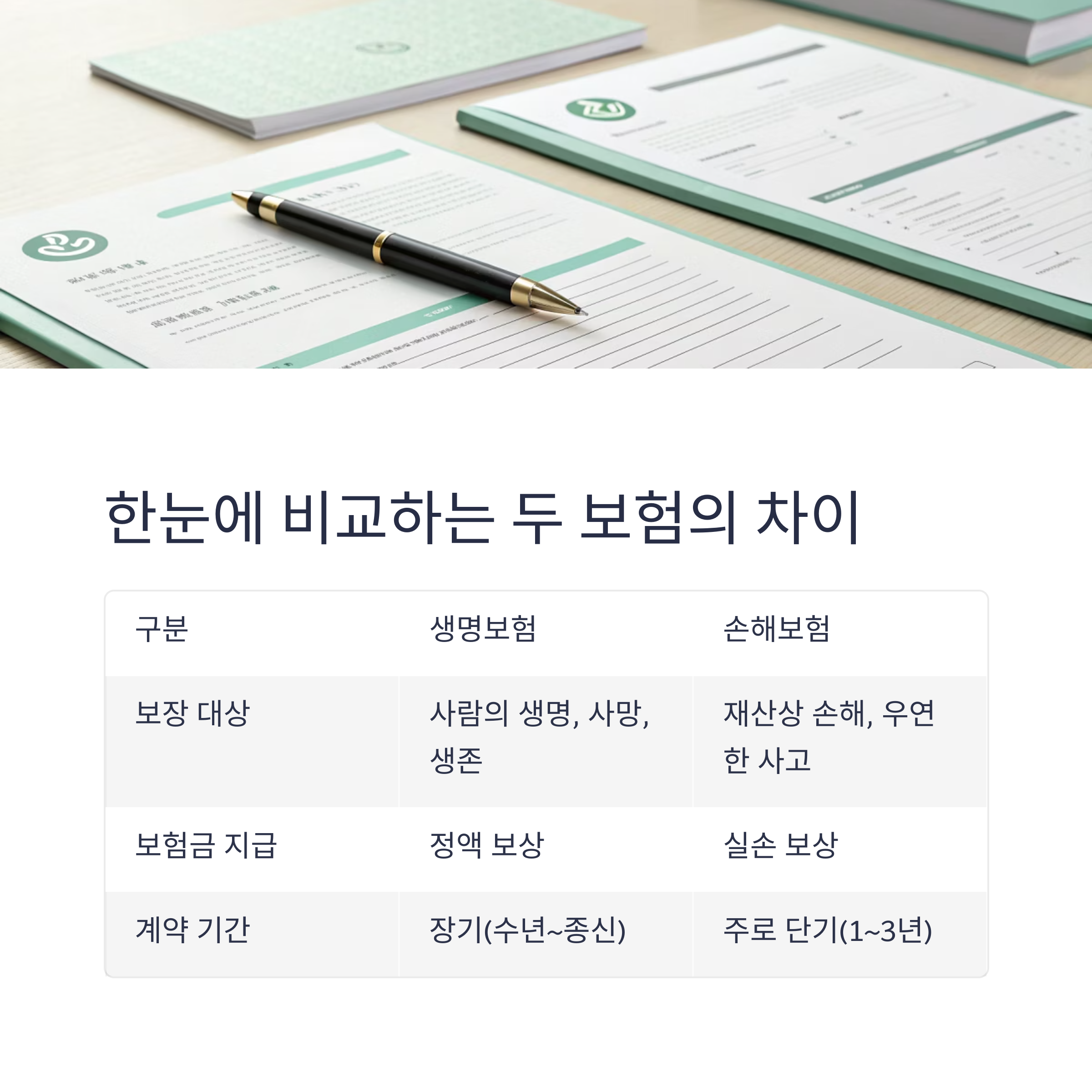 보험은 위험에 대비해 경제적 손실을 보장받는 대표적인 금융상품입니다. 그중에서도 생명보험과 손해보험은 보장 범위, 보험금 지급 방식, 계약 구조 등에서 뚜렷한 차이가 있습니다. 아래에서 두 보험의 핵심 차이점을 표와 함께 체계적으로 비교합니다.