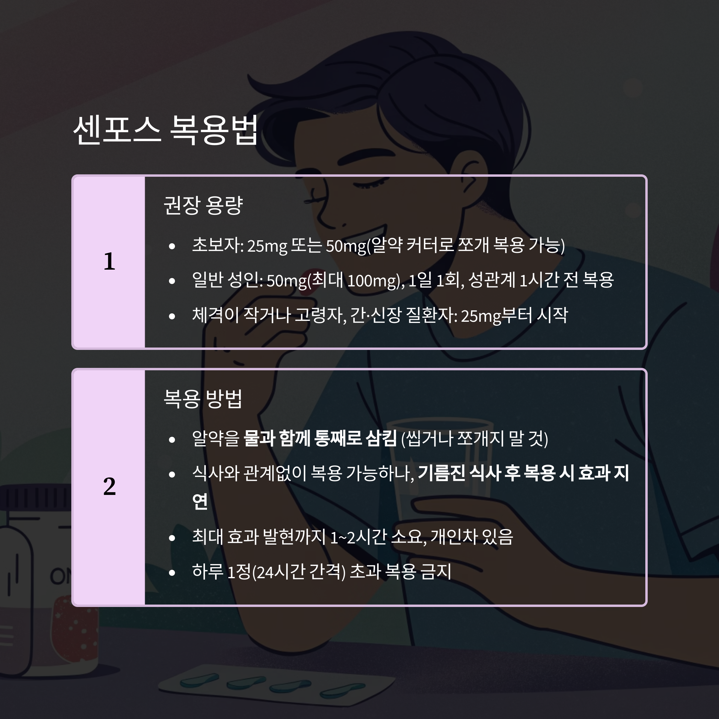 - 일반 성인: 50mg(최대 100mg), 1일 1회, 성관계 1시간 전 복용