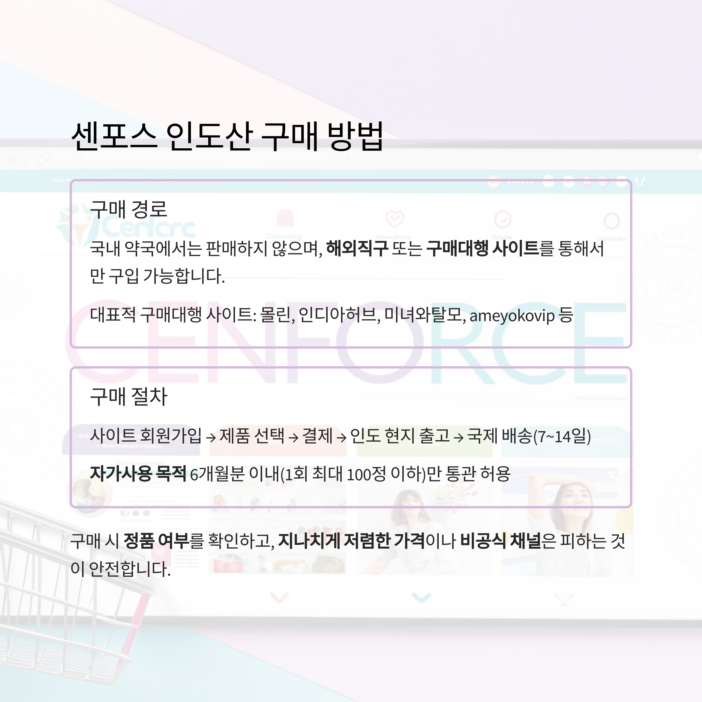 - 대표적 구매대행 사이트: 몰린, 인디아허브, 미녀와탈모, ameyokovip 등에서 판매(제품명: 센포스 25/50/100/150/200mg 등 다양한 용량)