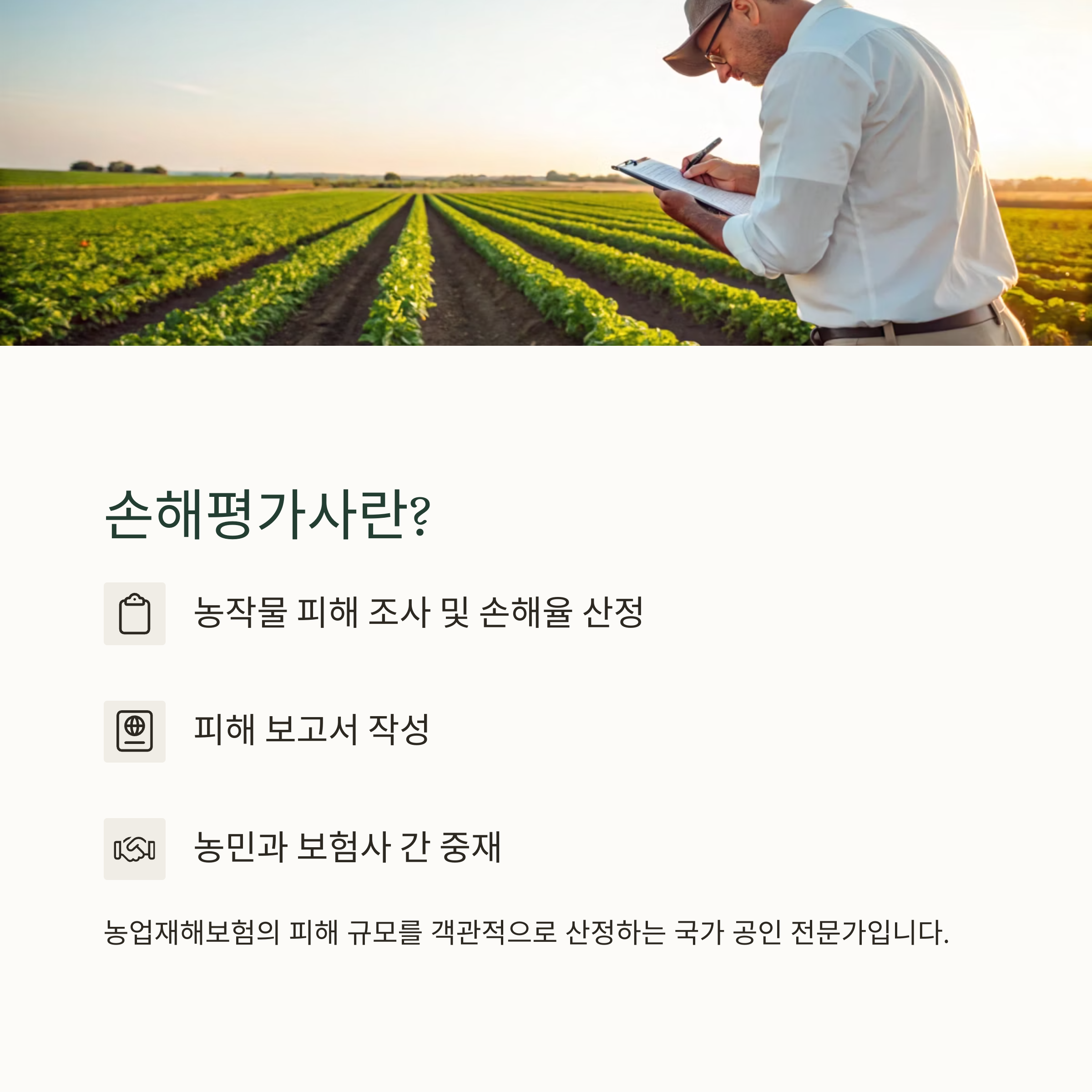 손해평가사는 농업재해보험의 피해 규모를 객관적으로 산정하는 전문 자격자입니다.