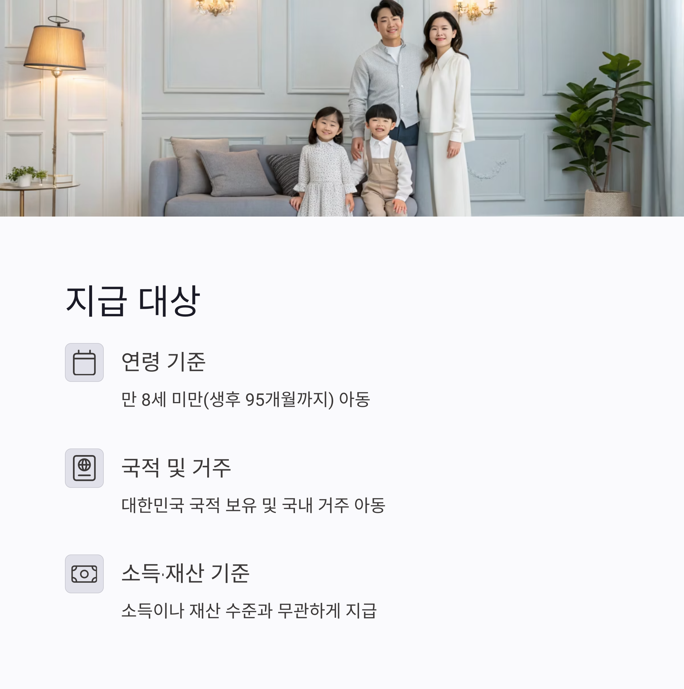 아동수당은 다음의 기준을 모두 충족하는 아동에게 지급됩니다.