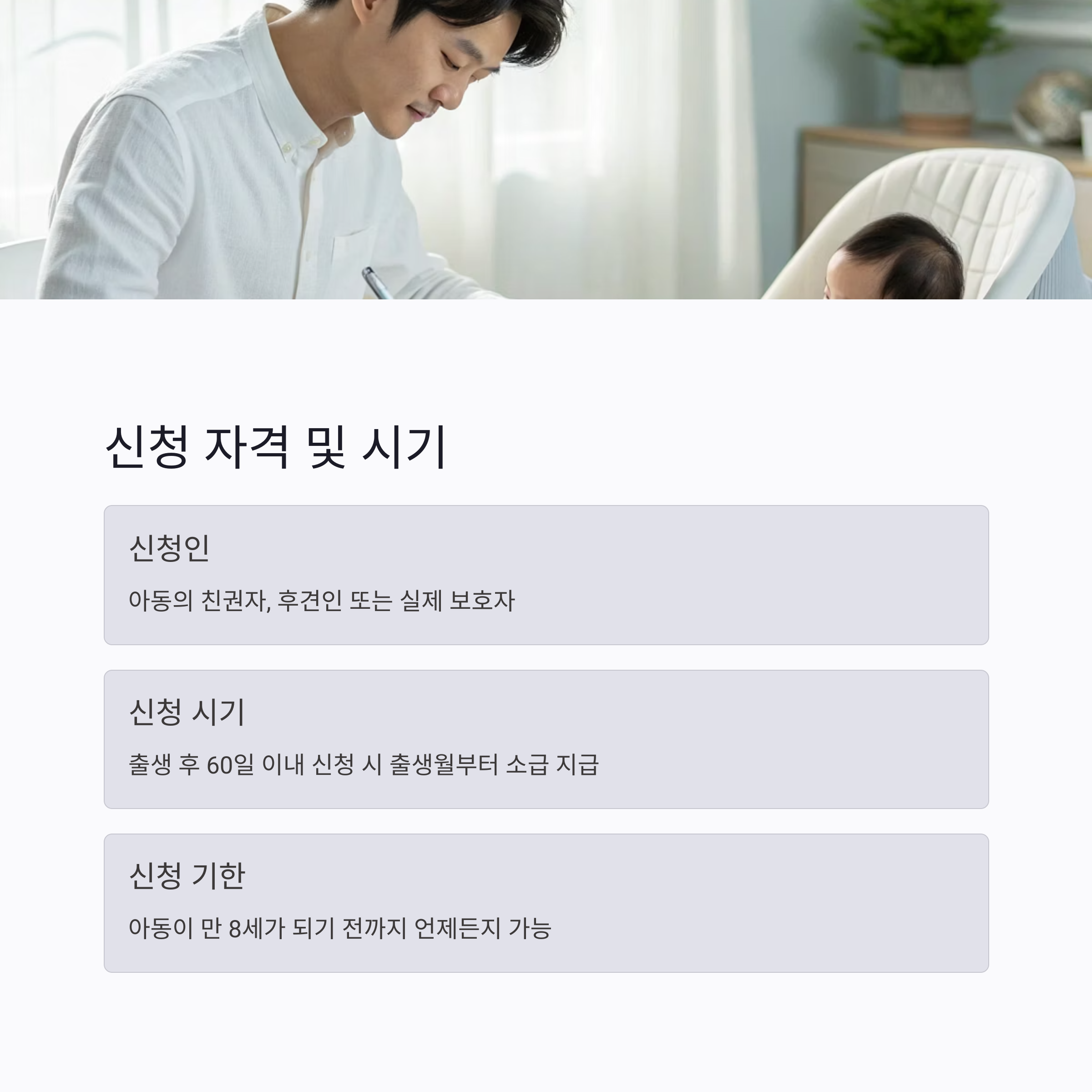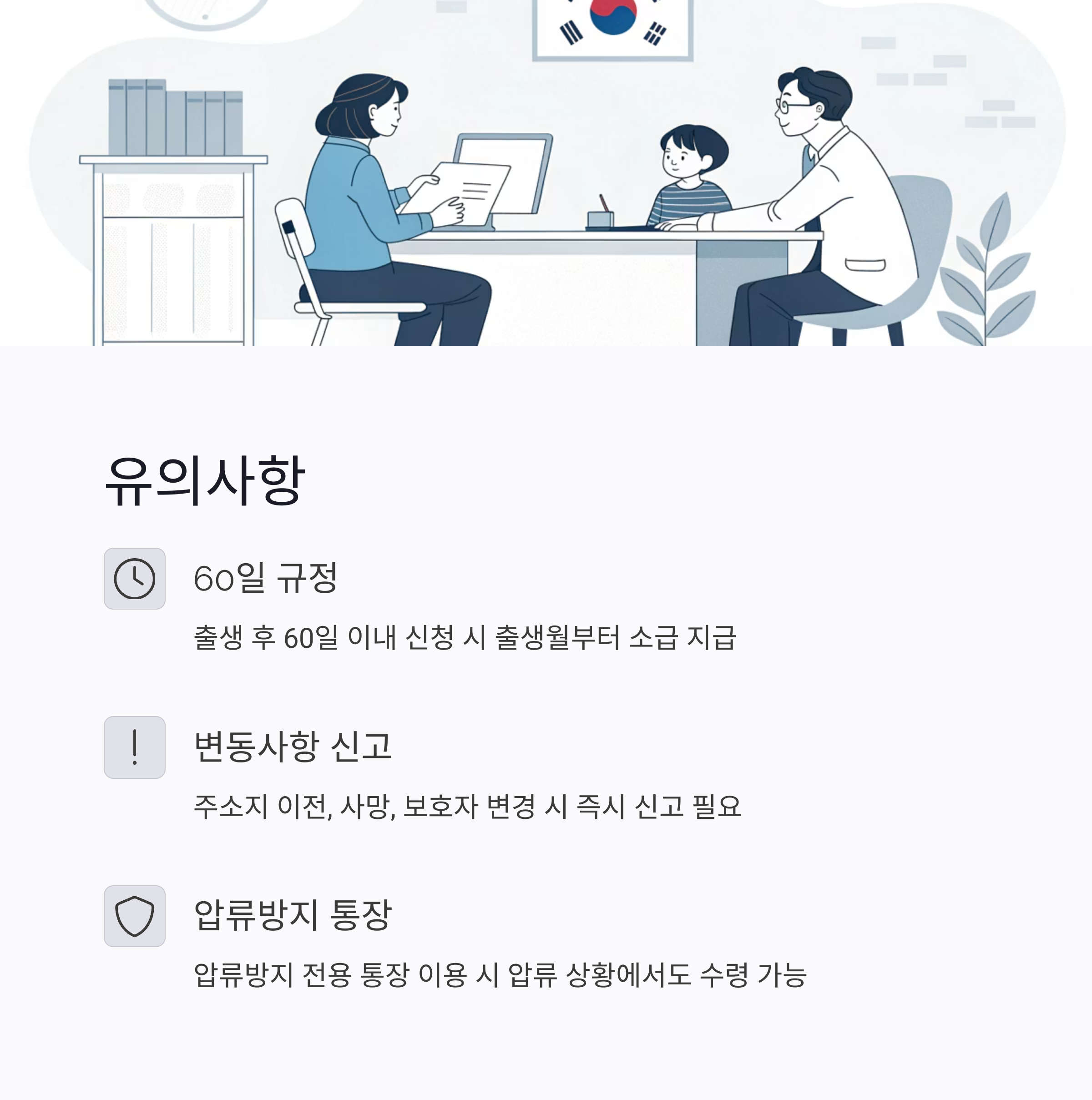 - 출생 후 60일 이내 신청해야 출생월부터 소급하여 받을 수 있다는 점을 놓치지 마세요.