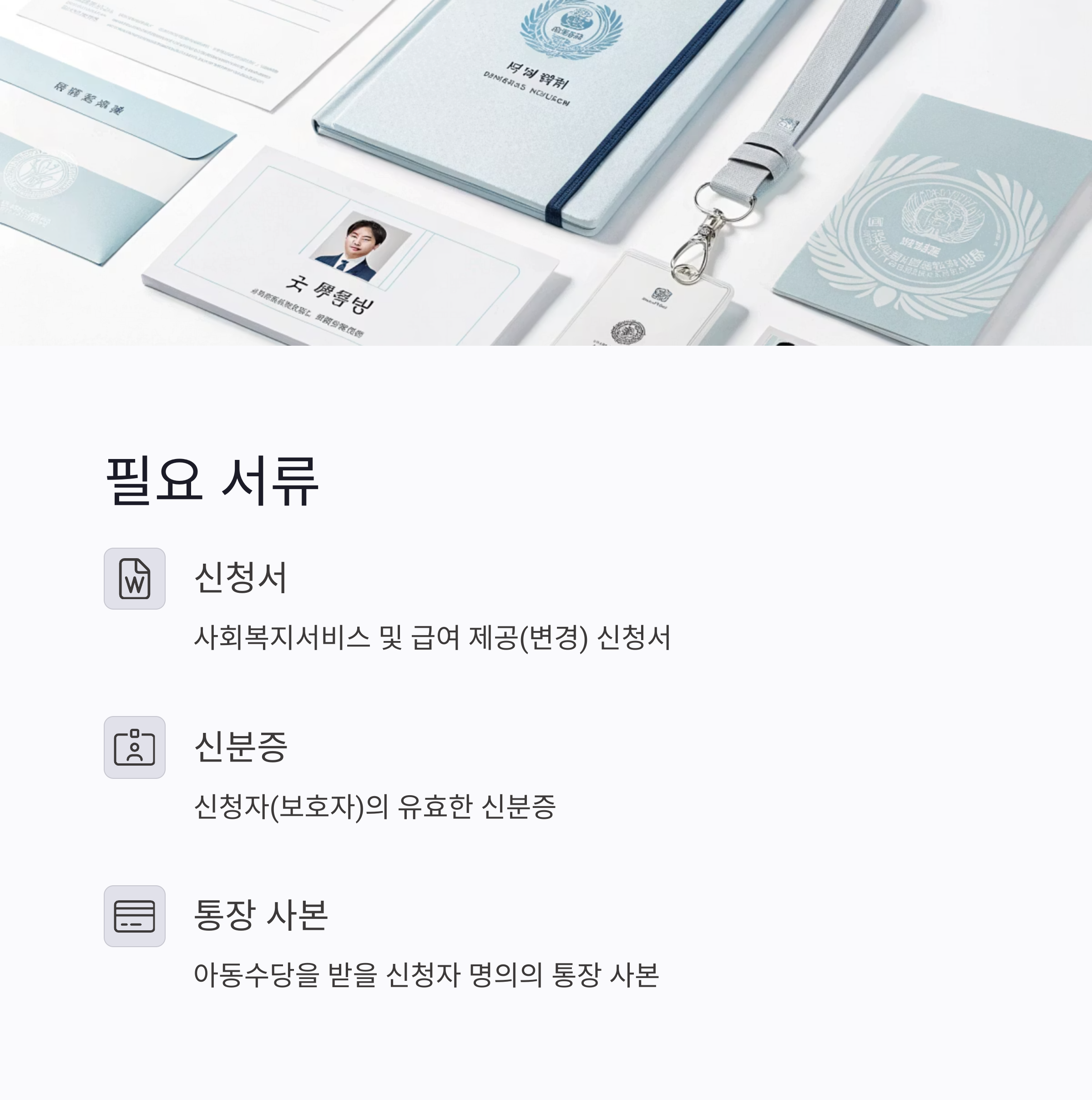 - (대리 신청 시) 대리인 신분증 및 위임장: 보호자가 직접 신청하기 어려운 경우 대리 신청 가능 (위임 관계 확인 필요)