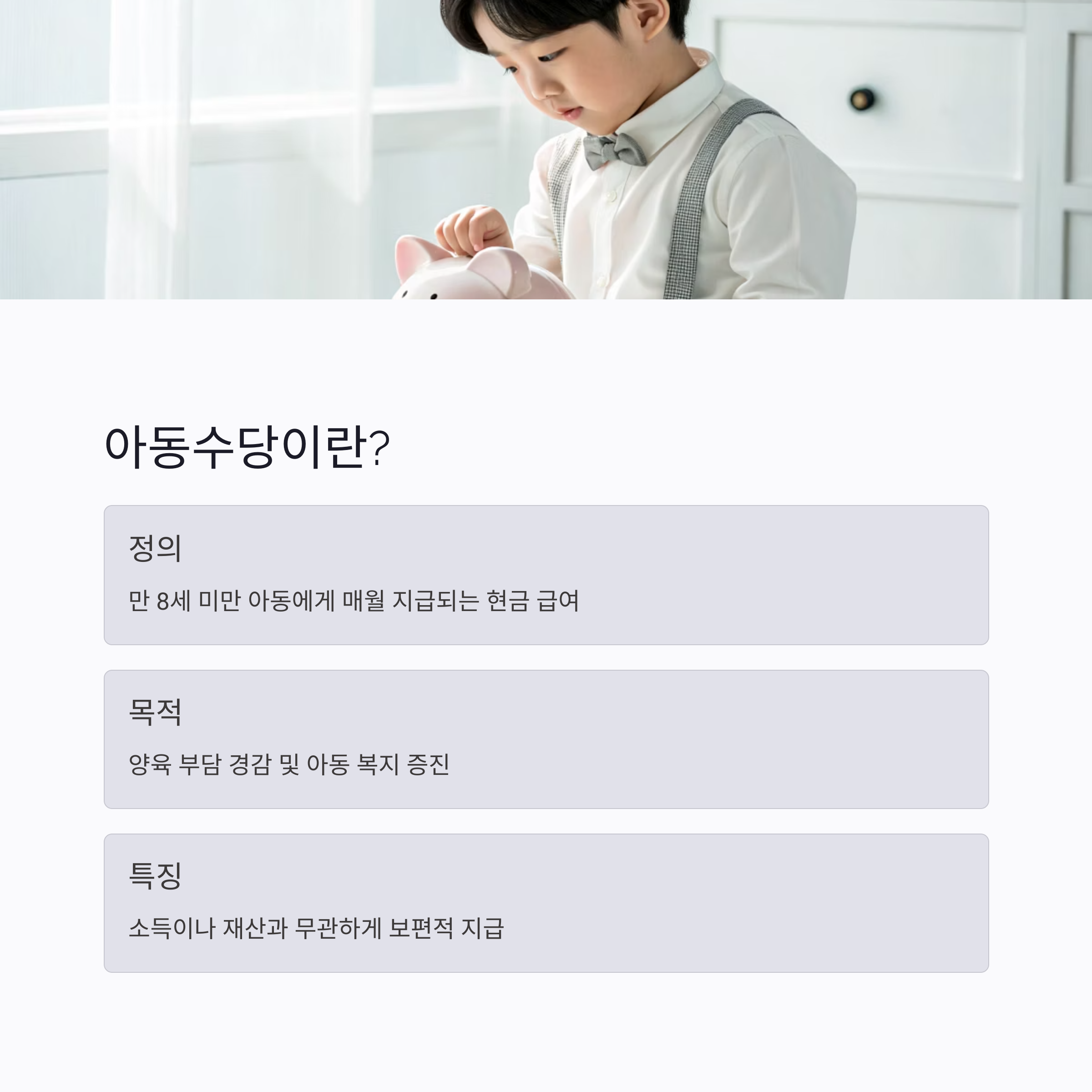 우리 아이들이 건강하고 행복하게 성장할 수 있도록 국가가 지원하는 아동수당 제도는 만 8세 미만 아동에게 매월 일정 금액을 지급하여 양육 부담을 줄이고 아동 양육에 대한 국가 책임을 강화하는 중요한 복지 정책입니다. 소득이나 재산 수준과 상관없이 지급되기 때문에 대상이 되는 모든 아동이 혜택을 받을 수 있습니다.