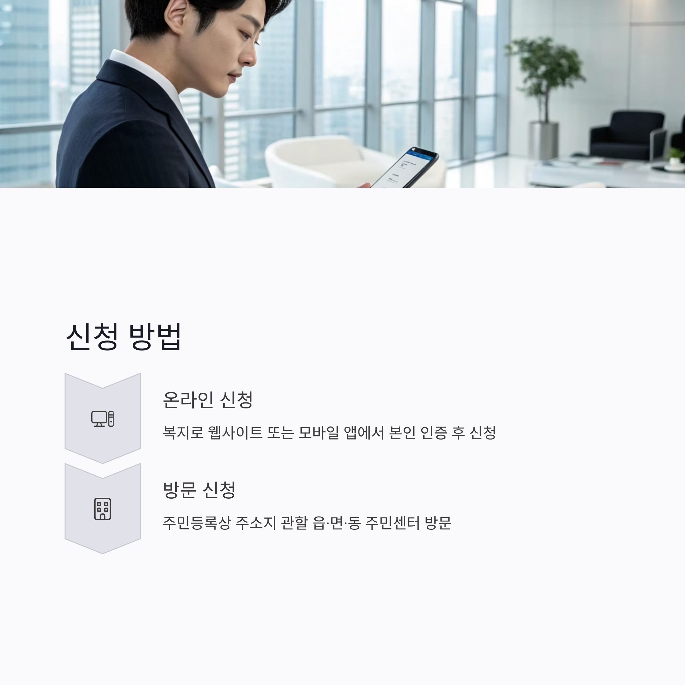 - 주소지 관할 읍·면·동 주민센터 (행정복지센터): 가장 정확하고 개인별 맞춤 상담 및 방문 신청이 가능합니다.