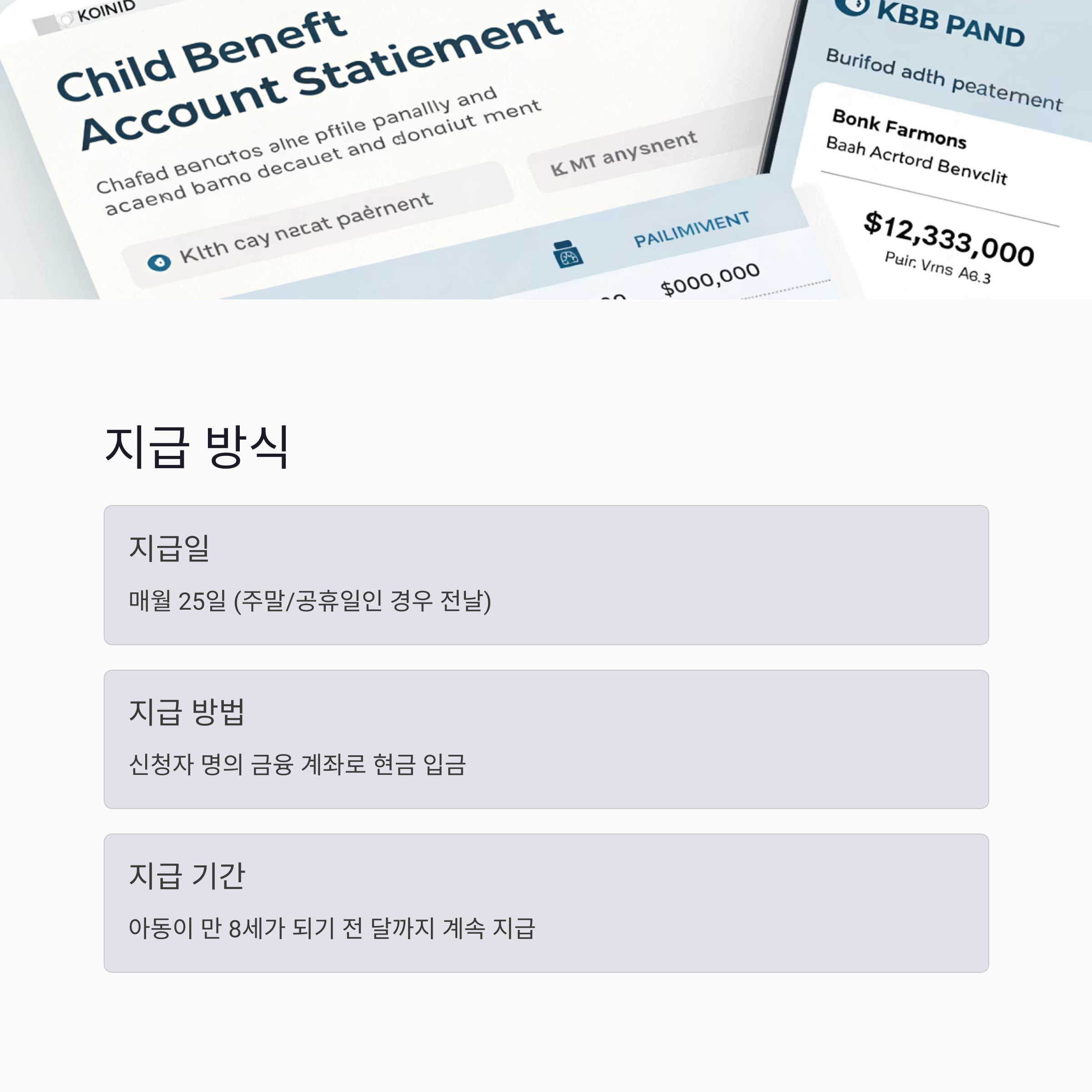아동이 만 8세가 되기 전 달까지 계속 지급되며, 별도의 자격 확인 절차 없이 주민등록상 거주 및 생존 여부 등이 지속적으로 확인됩니다.