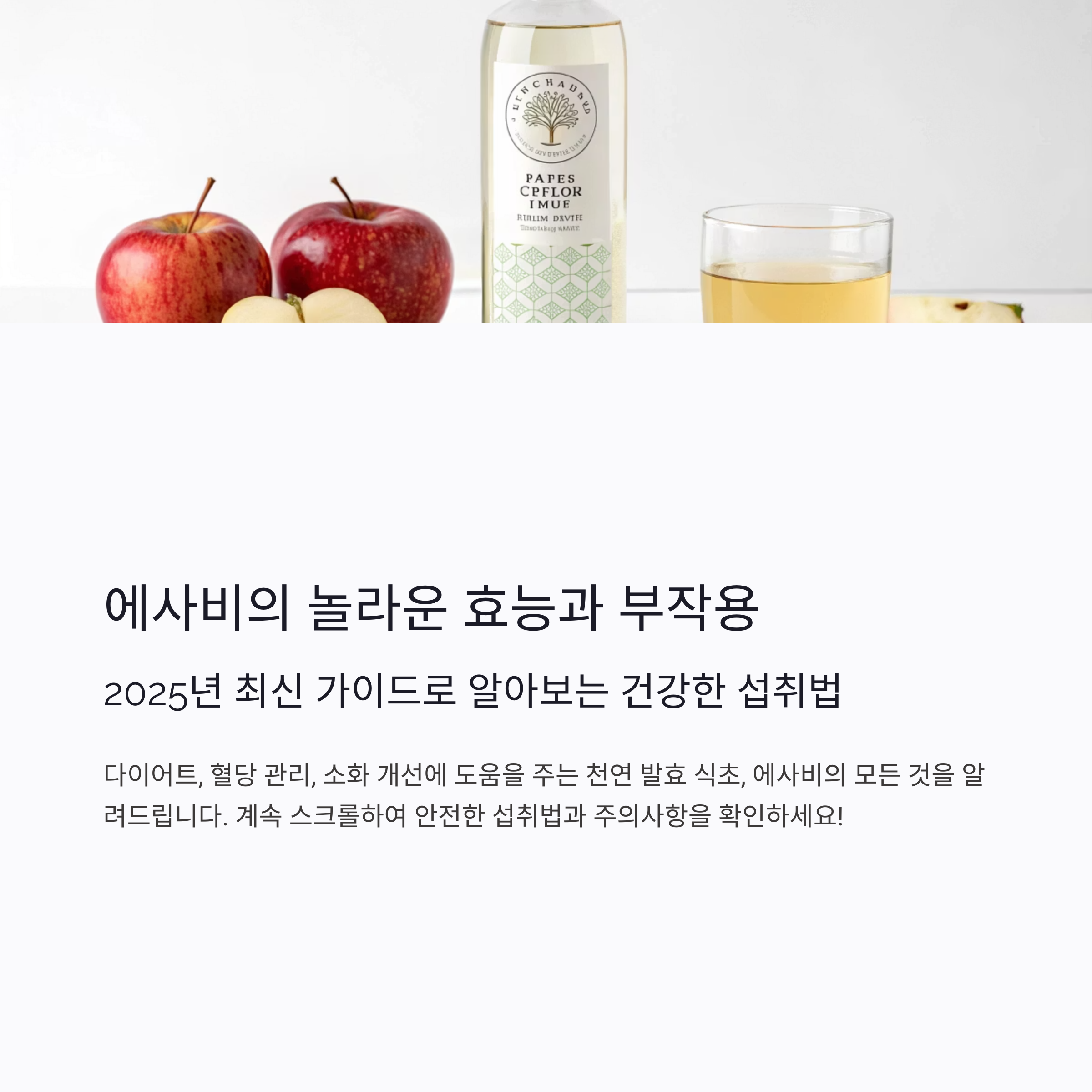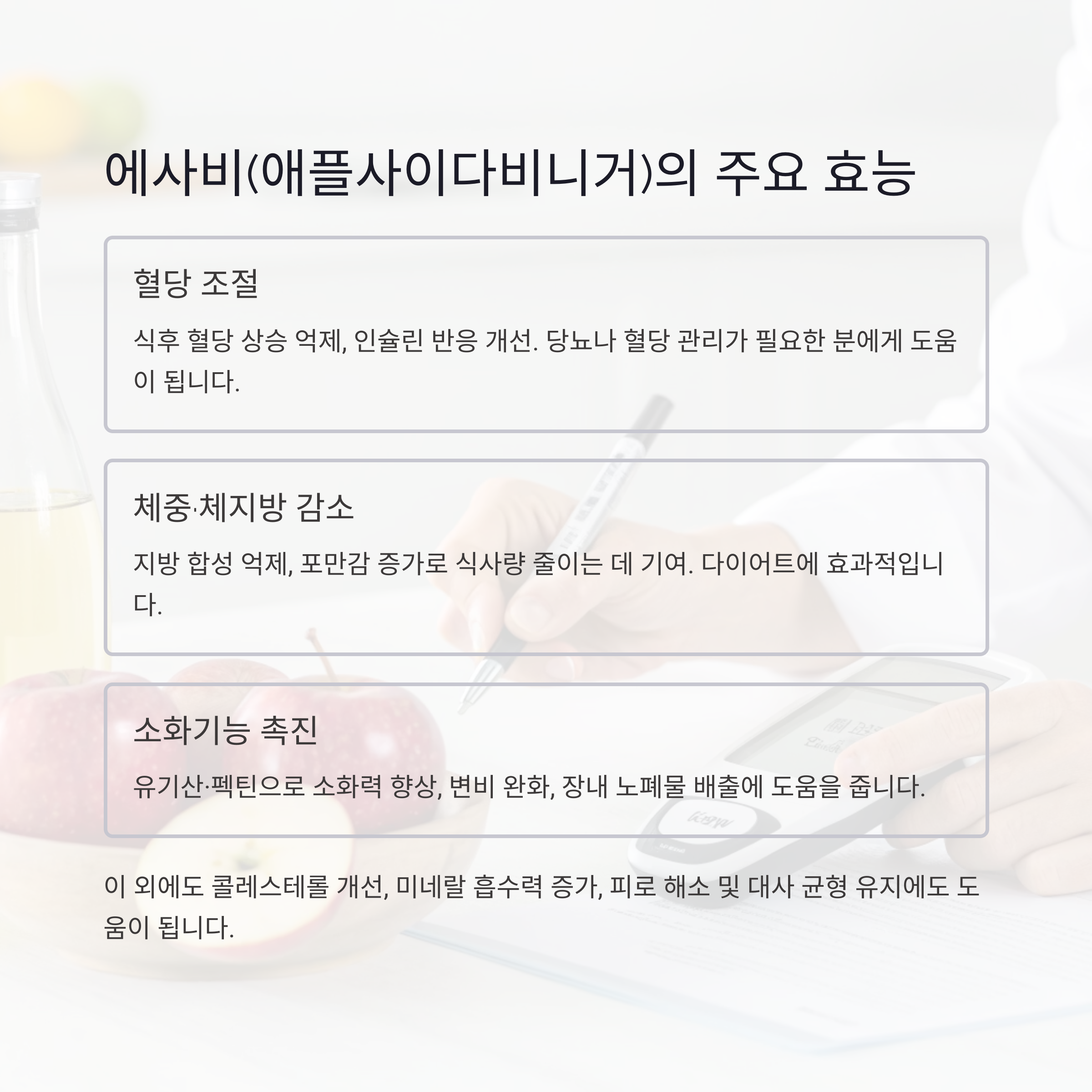 에사비(애플사이다비니거)는 혈당과 체중 관리에 일부 긍정적 효과를 보이나, 위장 장애, 저칼륨혈증 등 부작용 위험 또한 분명합니다. 2025년 기준 식품의약안전처, 국내외 전문가들은 장기간·과다 섭취, 원액 음용, 기존 질환자 무분별 복용은 금지하며, 반드시 희석·적정량 내 섭취와 정기적 건강상태 모니터링을 강조합니다. 의약품 복용자, 만성질환 환자, 임산부 등은 섭취 전 전문 상담이 필수입니다.