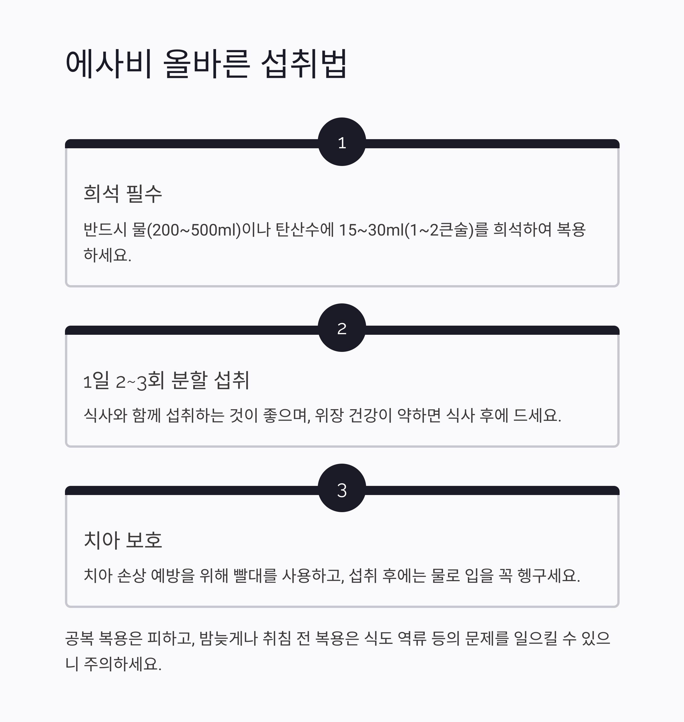 - 희석 필수: 반드시 물(200~500ml)이나 탄산수에 희석해 15~30ml(1~2큰술) 복용.
