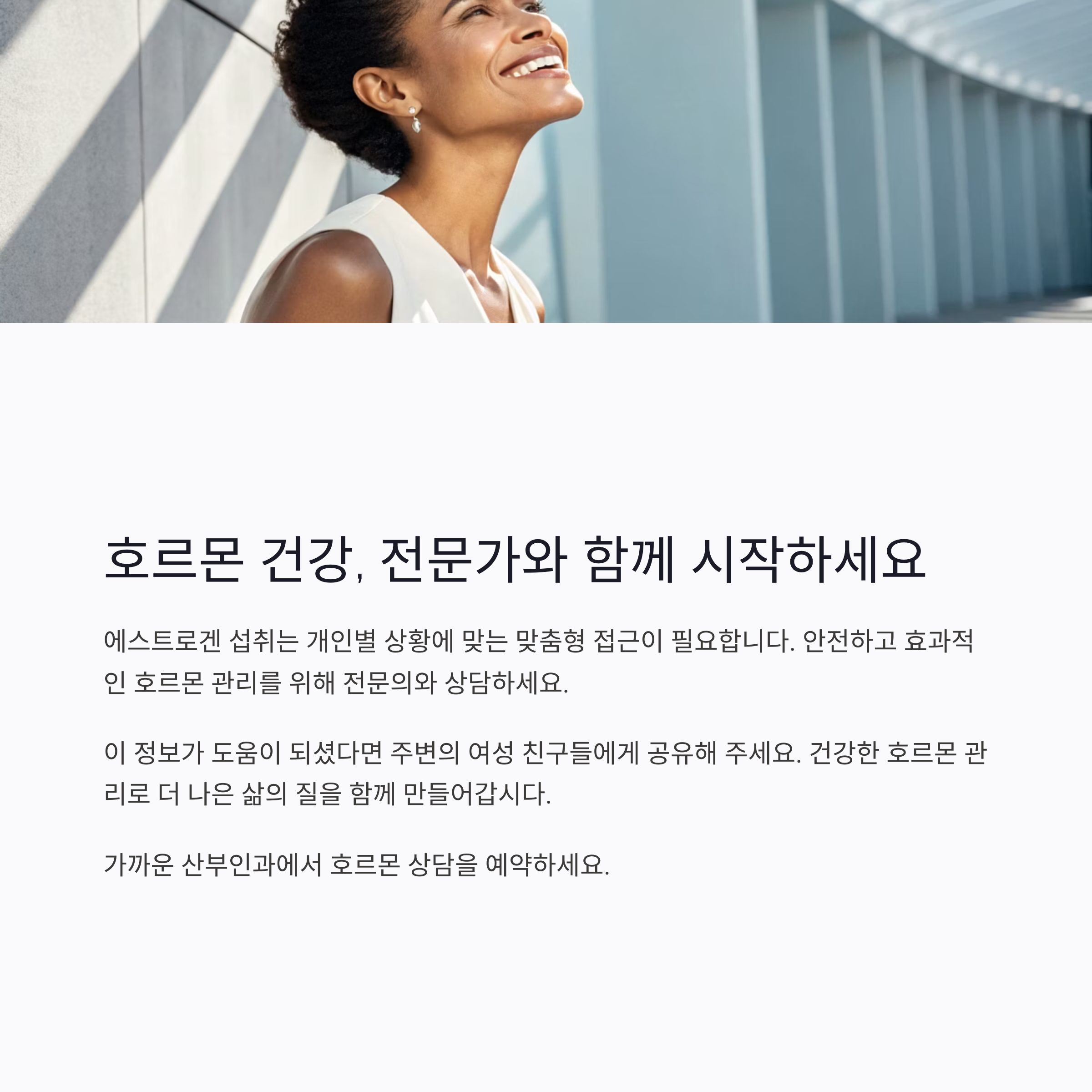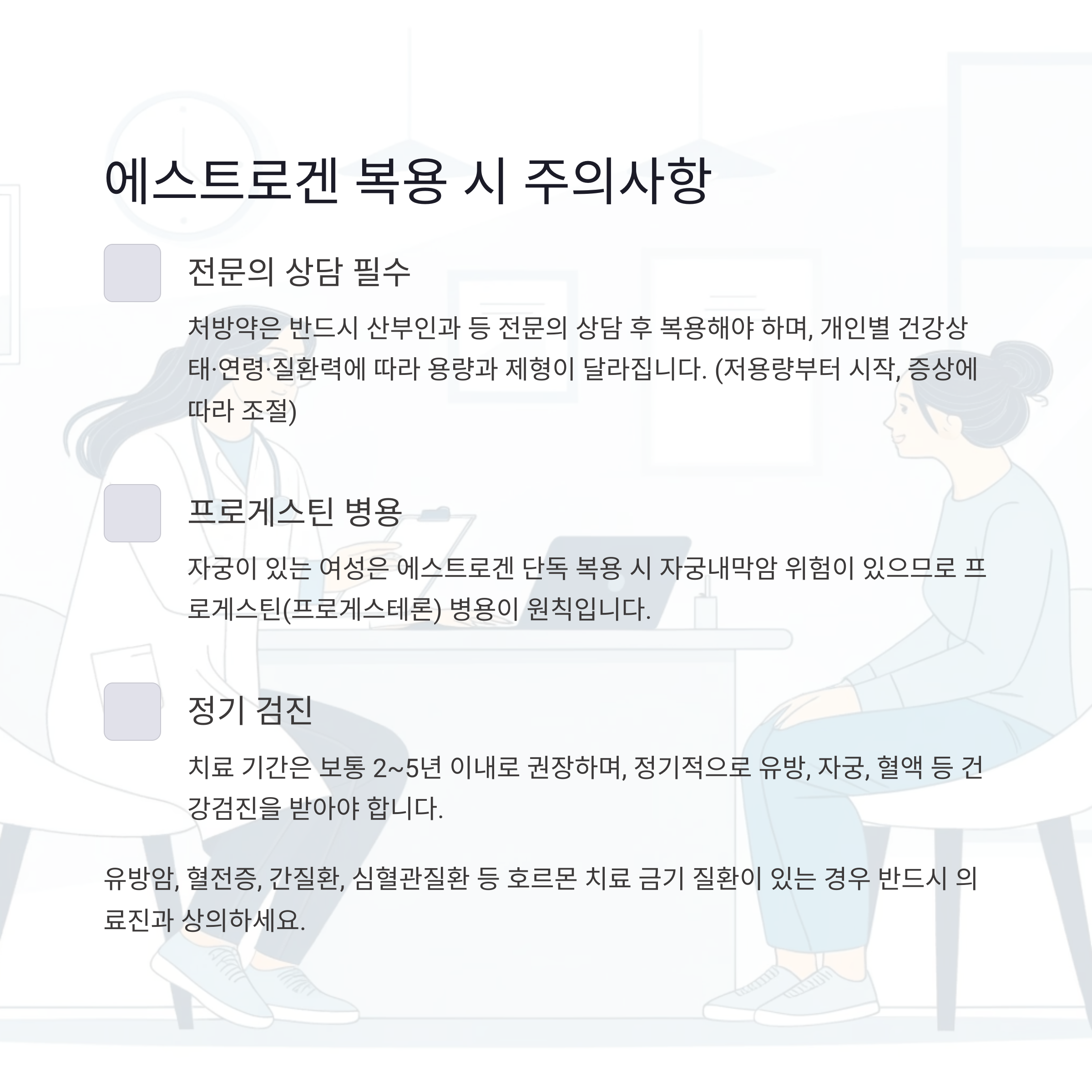 - 유방암, 혈전증, 간질환, 심혈관질환 등 호르몬 치료 금기 질환이 있는 경우 반드시 의료진과 상의해야 합니다.