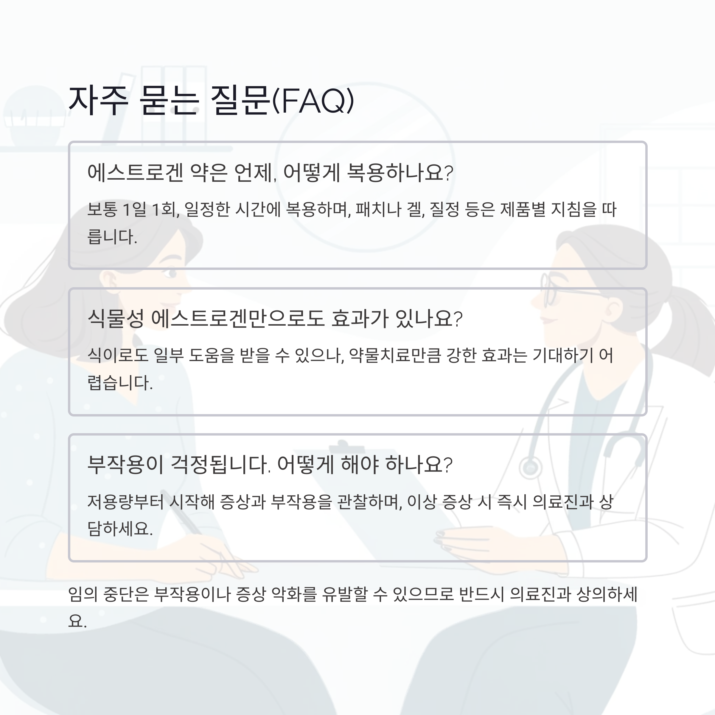A. 저용량부터 시작해 증상과 부작용을 관찰하며, 이상 증상 시 즉시 의료진과 상담하세요. - Q. 에스트로겐 복용 중 운동이나 식단 조절이 필요한가요?