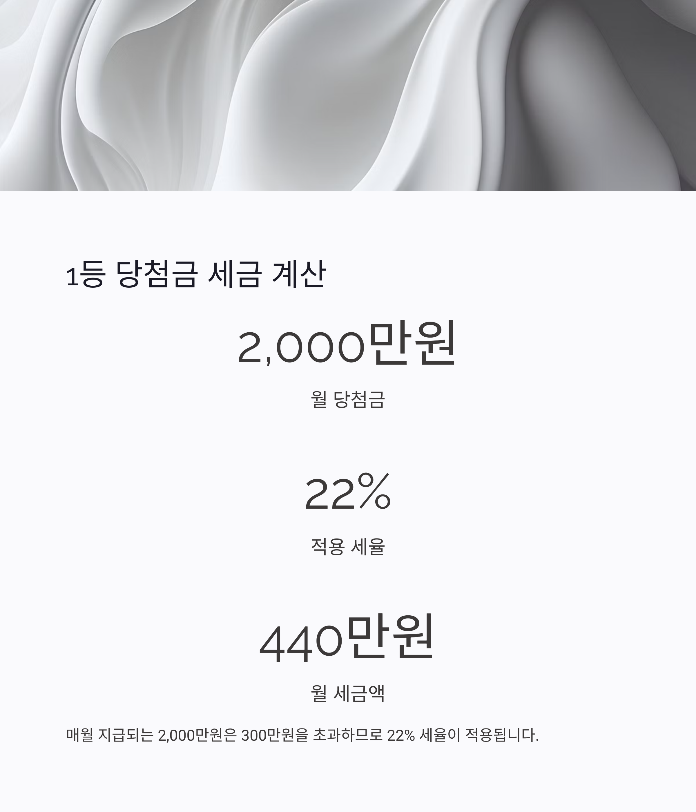 복권 당첨금에는 세금이 부과되는데, 연금복권 1등 당첨금은 매월 지급되는 형태이므로 세금 계산 방식에 대한 이해가 필요합니다. 이 글에서는 연금복권 1등 당첨금에 적용되는 세금 종류와 세율은 어떻게 되는지, 그리고 세금 공제 후 실제 수령하게 되는 월 실수령액과 총 실수령액은 얼마인지 상세히 계산하여 안내해 드리겠습니다.
