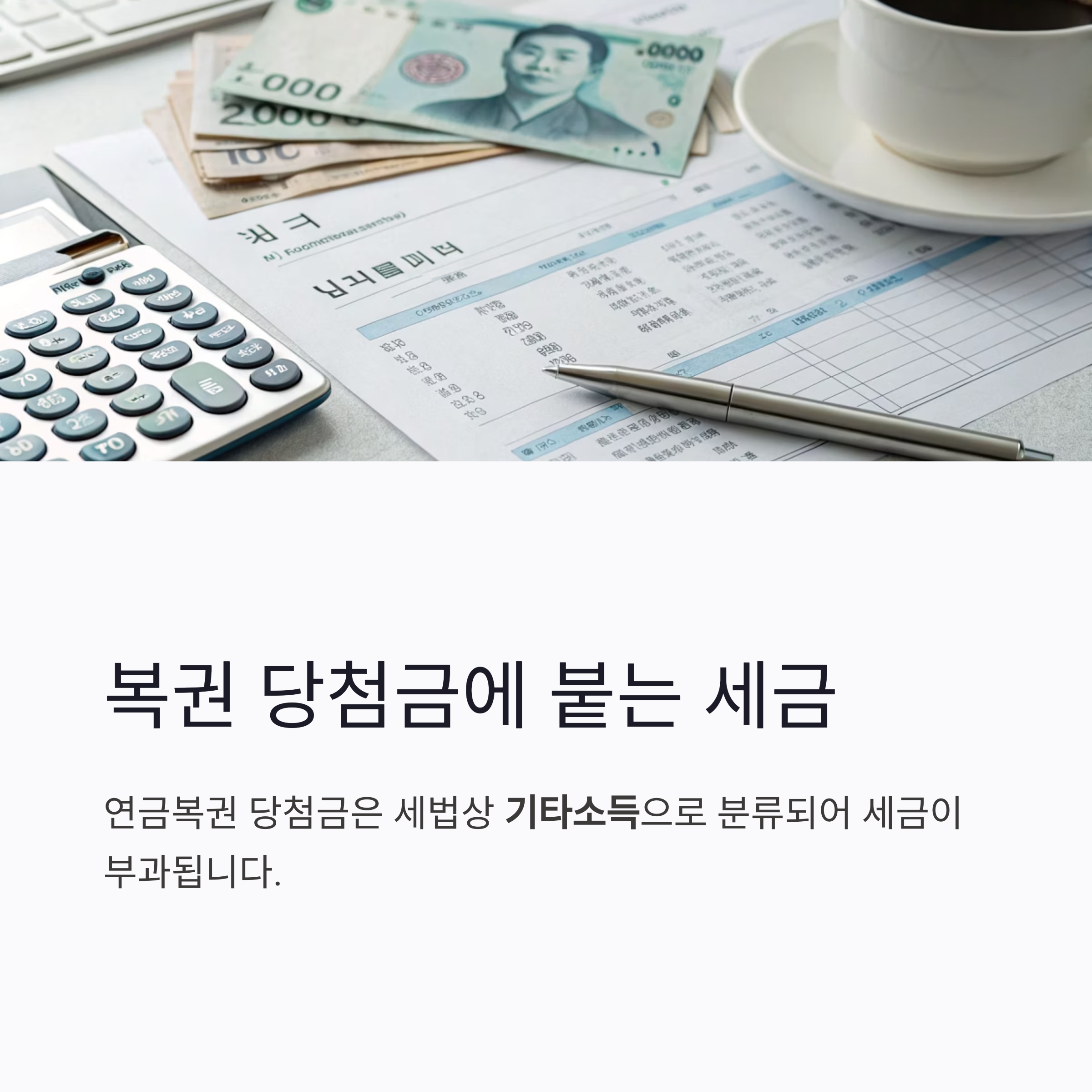 복권 당첨금은 세법상 기타소득으로 분류되어 세금이 부과됩니다. 연금복권 당첨금에도 이 기타소득세가 적용됩니다.