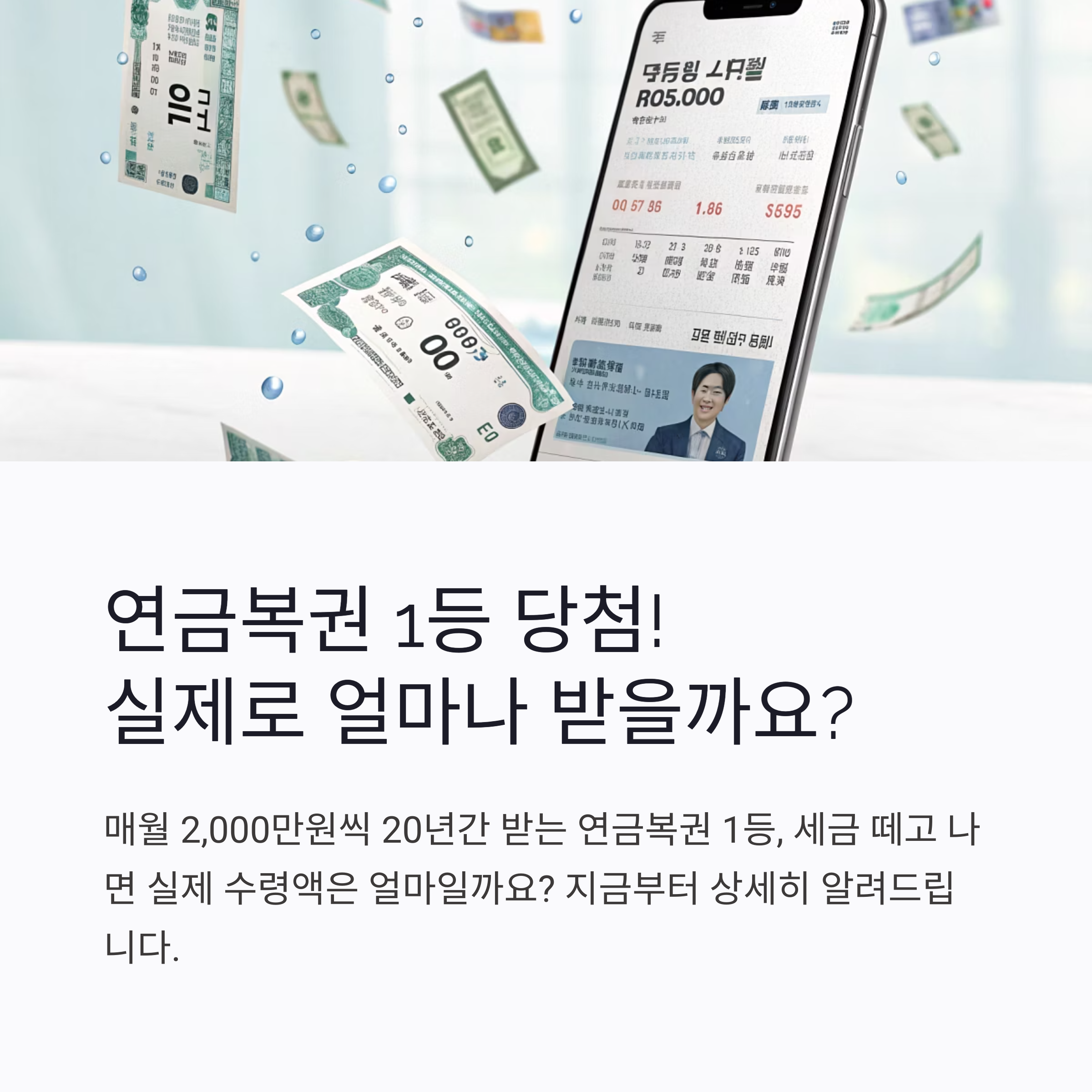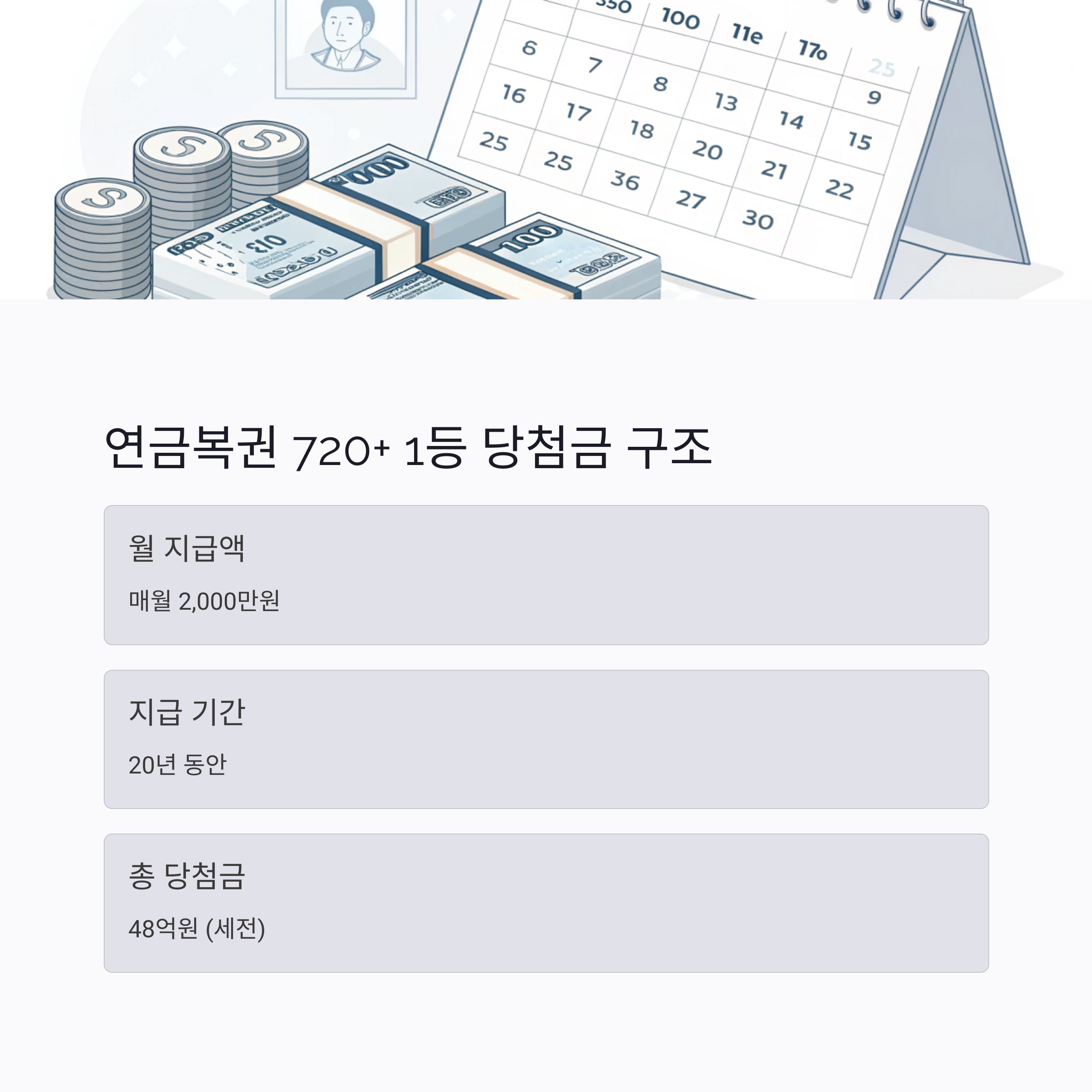 매주 추첨하는 연금복권 720+는 1등 당첨 시 매월 2,000만 원을 20년간 지급받는 구조로, 당첨된다면 비교적 안정적인 생활을 누릴 수 있다는 매력 때문에 많은 분들이 구매하고 있습니다. 하지만 당첨금은 세금의 영향을 받기 때문에, 실제로 내 통장에 입금되는 금액(실수령액)이 얼마인지는 많은 분들의 궁금증을 자아냅니다.
