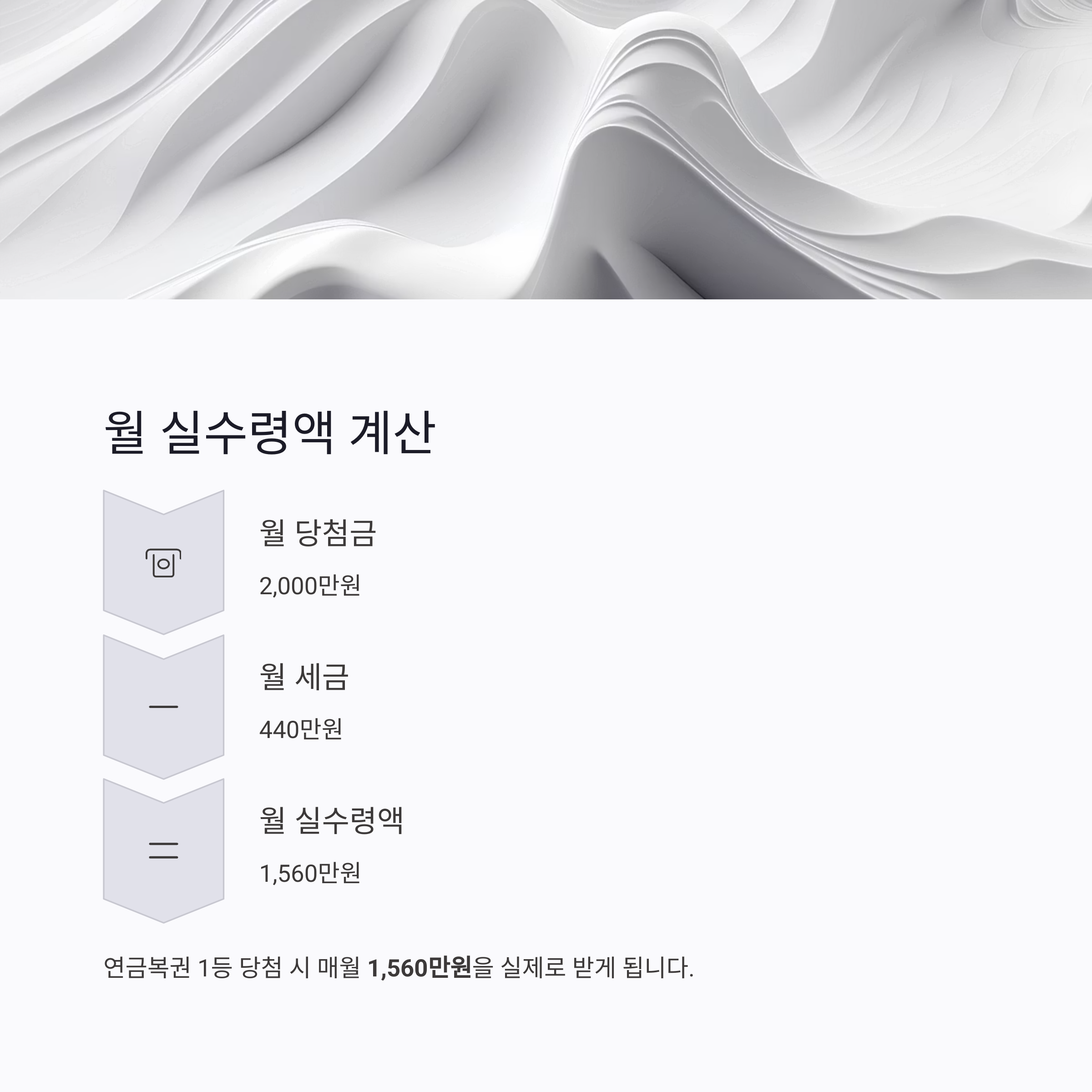 연금복권 1등 당첨은 일생일대의 행운이며, 세금 공제 후에도 매월 상당한 금액을 20년간 받게 됩니다. 세금 계산 방식을 이해하고 실수령액을 정확히 파악하여 당첨의 기쁨을 누리시길 바랍니다!