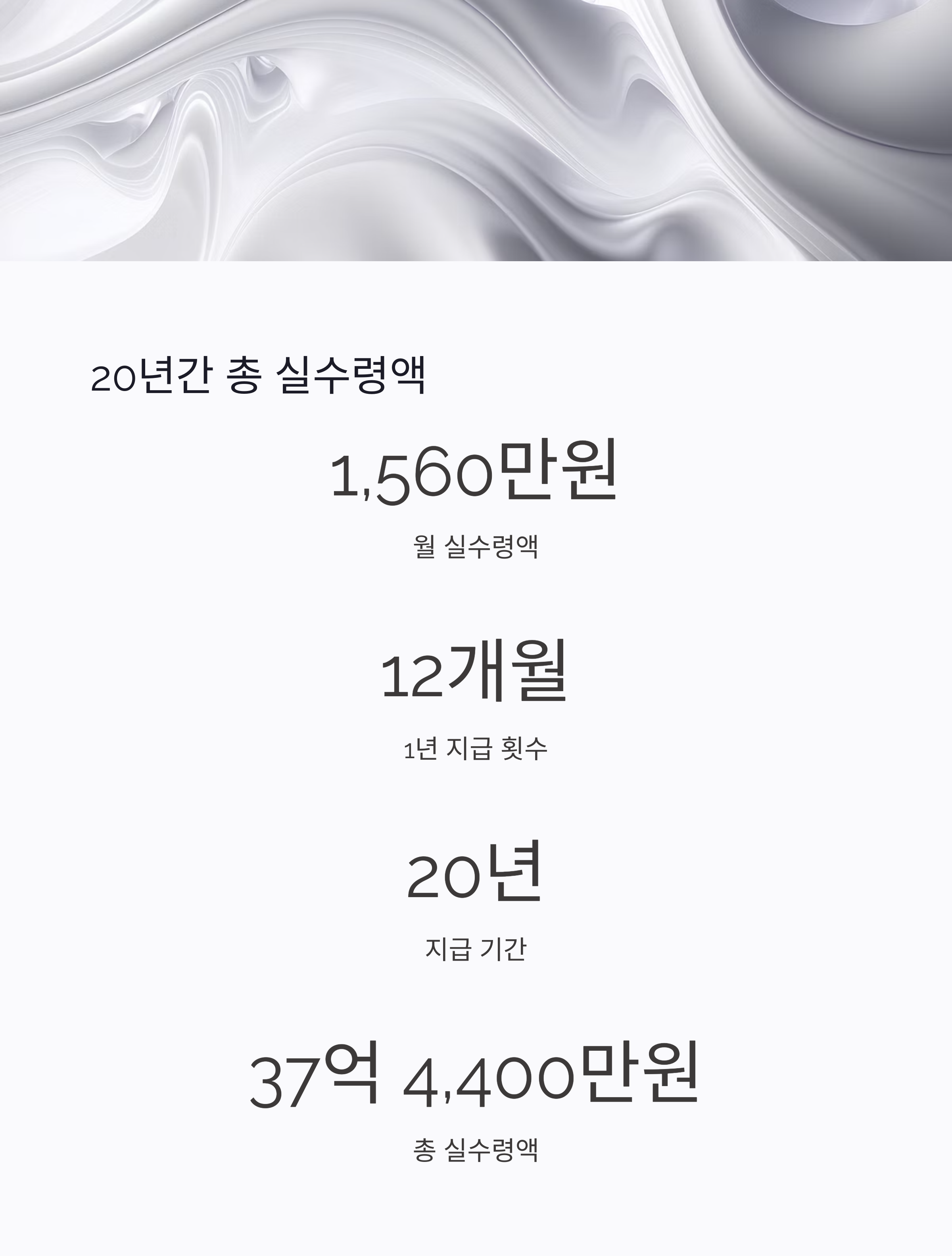 총 실수령액 = 1,560만 원 × 12 × 20 = 37억 4,400만 원