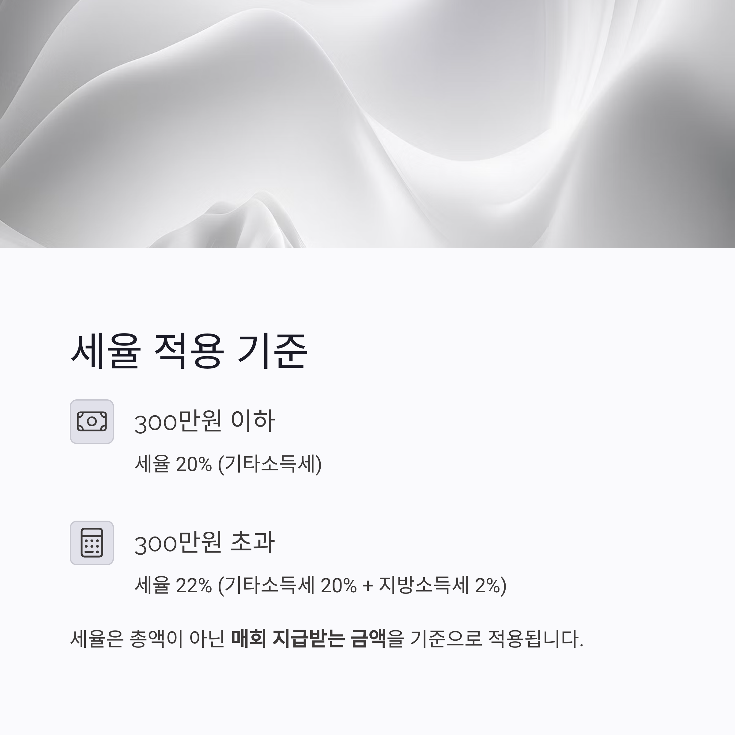 이 세율은 당첨금 총액이 아니라, **매회 지급받는 금액(건별)**을 기준으로 적용된다는 점이 중요합니다.