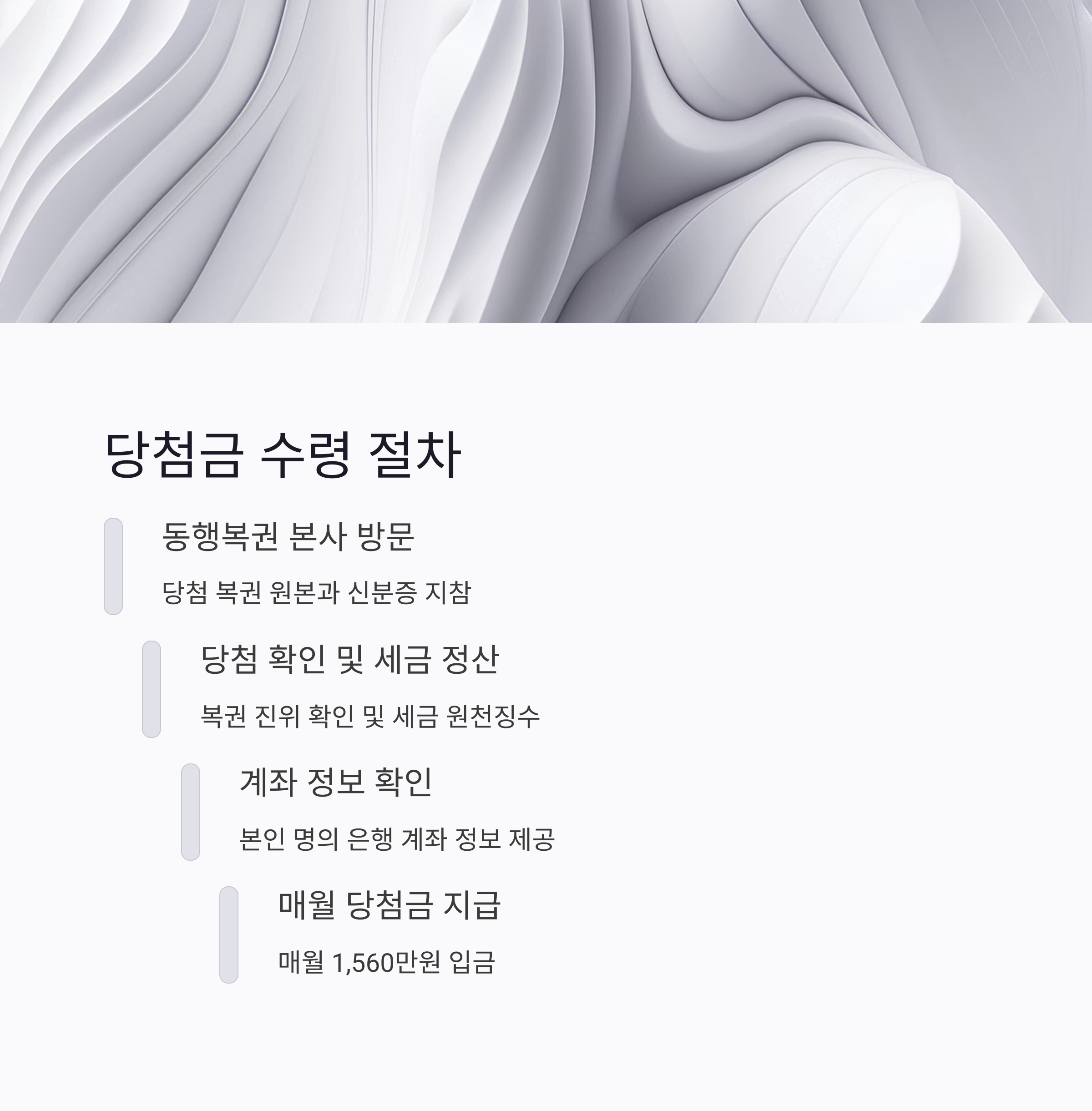- 매월 당첨금 지급: 세금이 공제된 월 실수령액(1,560만 원)이 매월 해당 계좌로 입금됩니다.