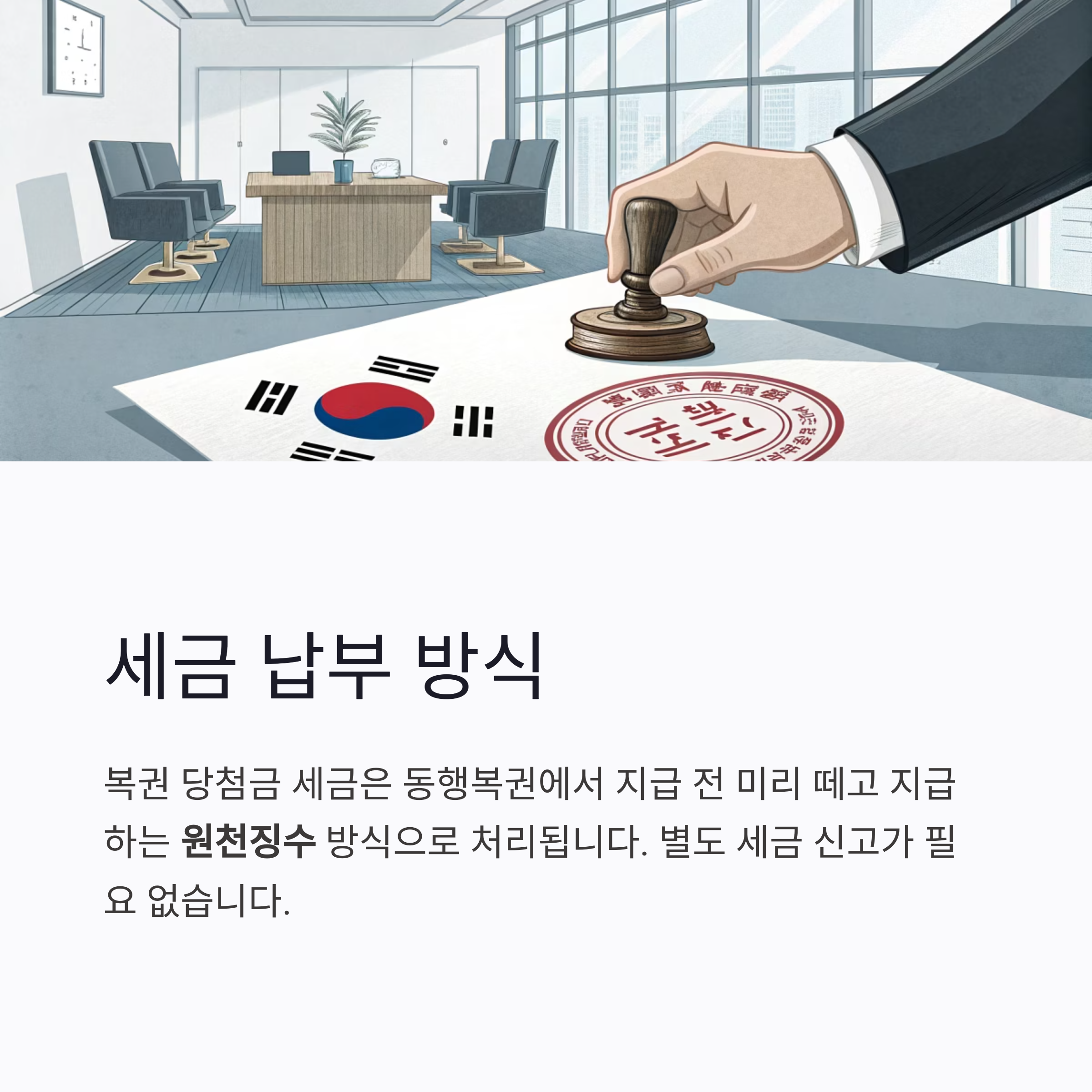 복권 당첨금에 대한 세금은 당첨금을 지급하는 기관(동행복권)에서 당첨자에게 지급하기 전에 미리 세금을 떼고 지급합니다. 이를 원천징수라고 합니다. 따라서 당첨자는 별도로 세금을 신고하고 납부할 필요 없이, 세금이 공제된 실수령액을 받게 됩니다.