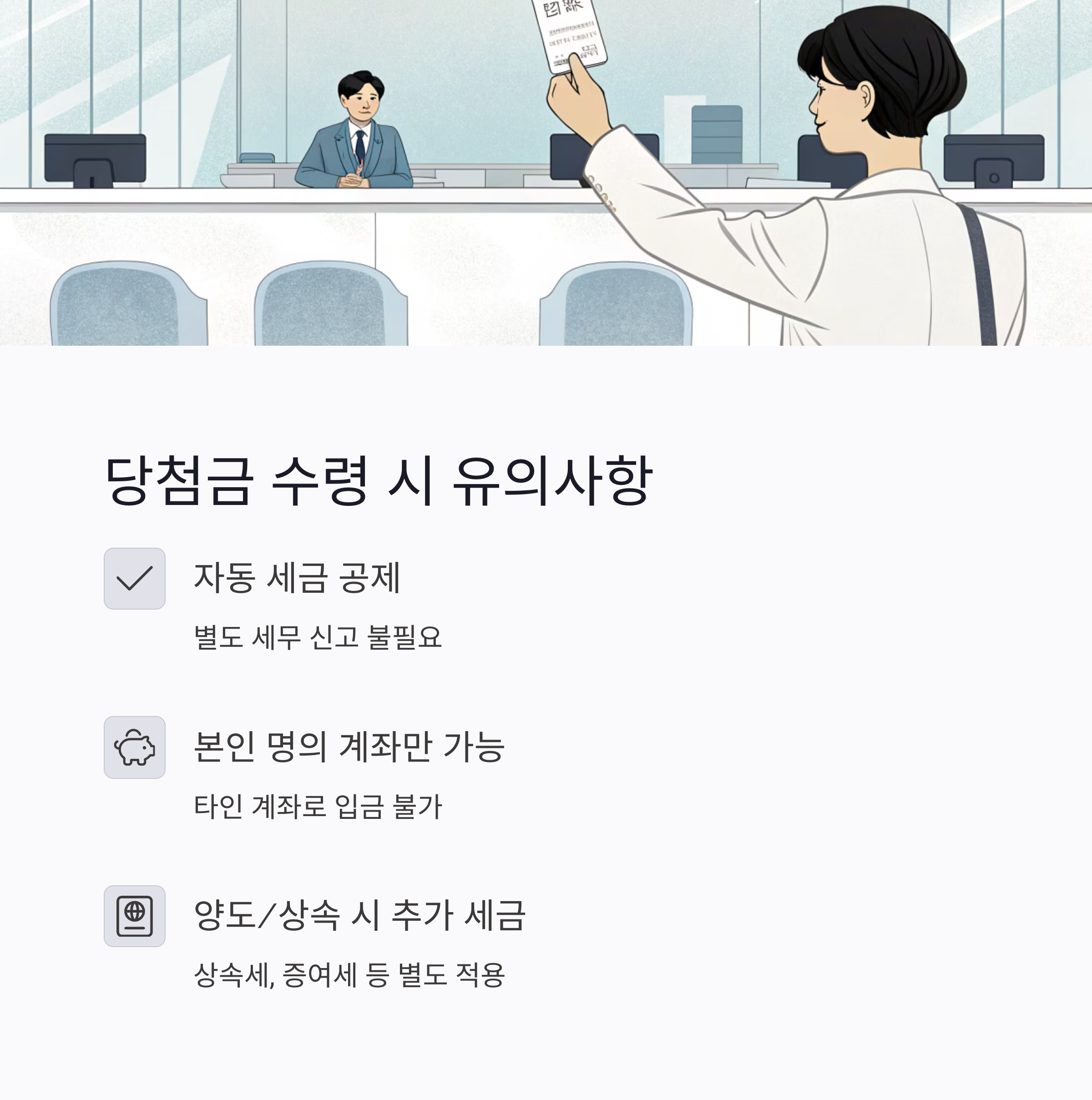 - 당첨금은 지정된 본인 명의 계좌로만 입금 가능하며, 양도나 상속 시에는 관련 세법(상속세, 증여세 등)이 별도로 적용될 수 있습니다.