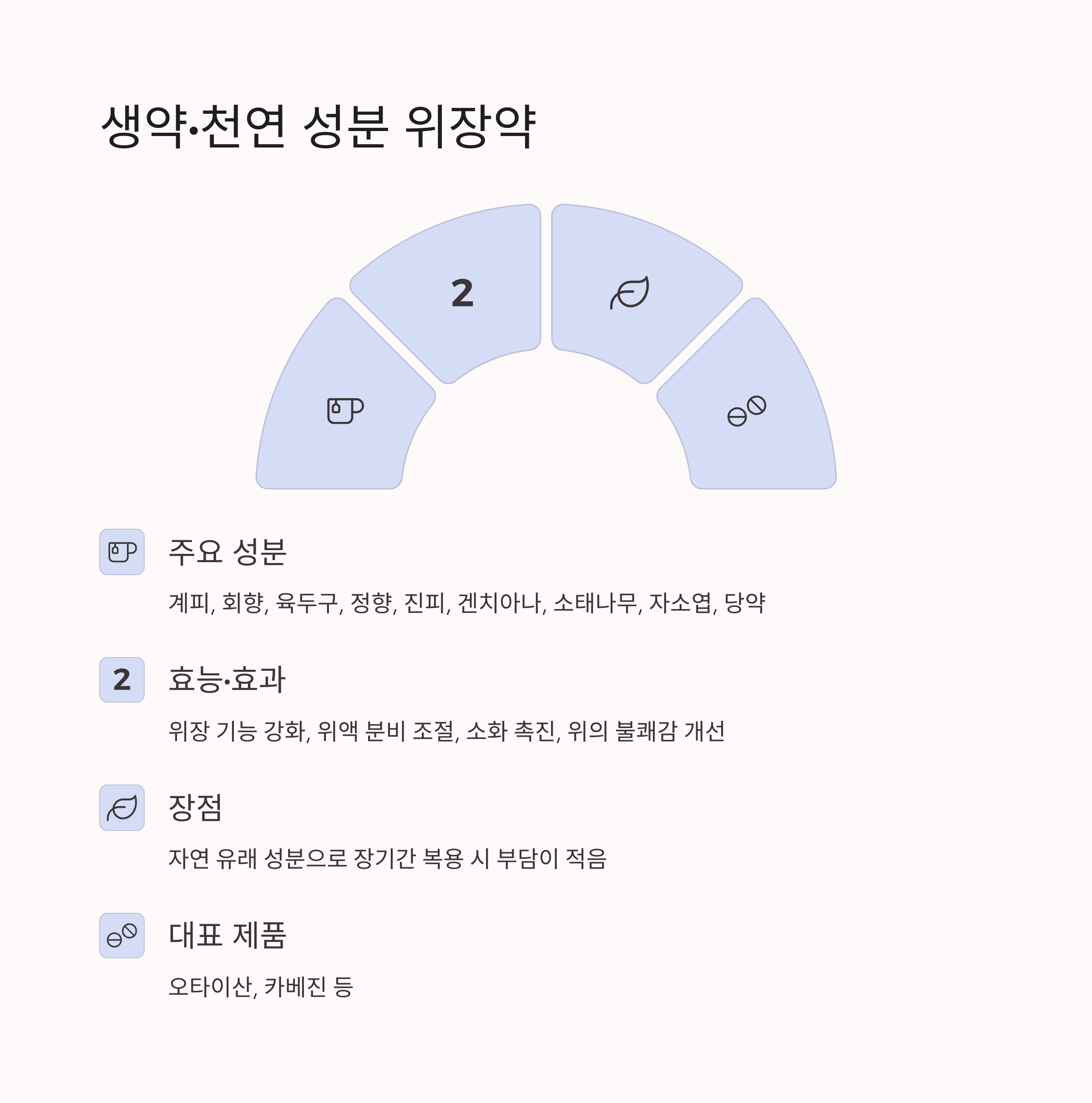 - 위장 기능 강화, 위액 분비 조절, 소화 촉진, 위의 불쾌감 개선