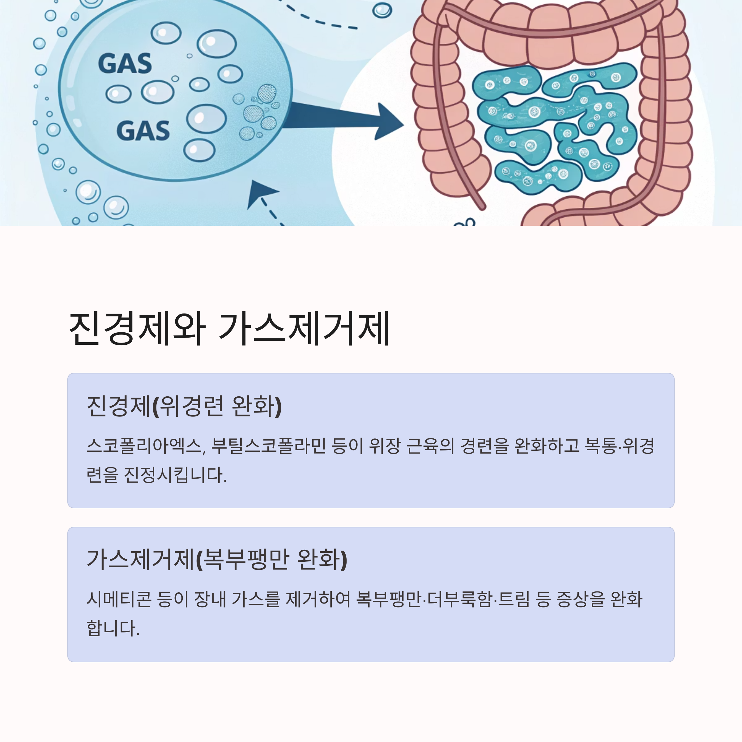 - 위장 근육의 경련 완화, 복통·위경련 진정